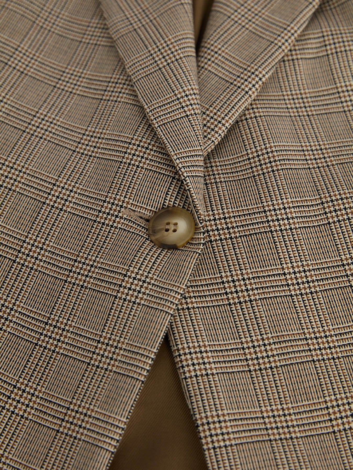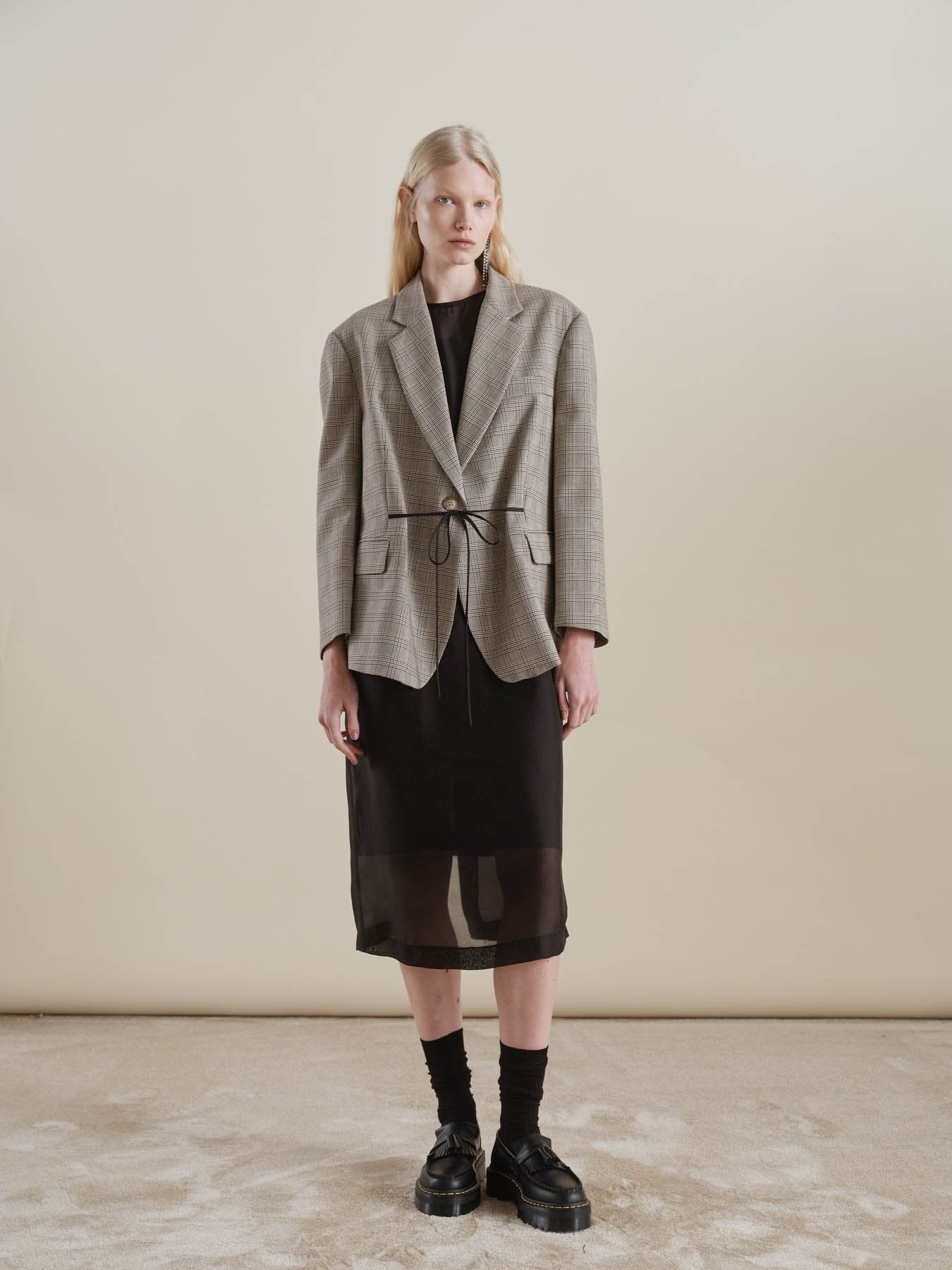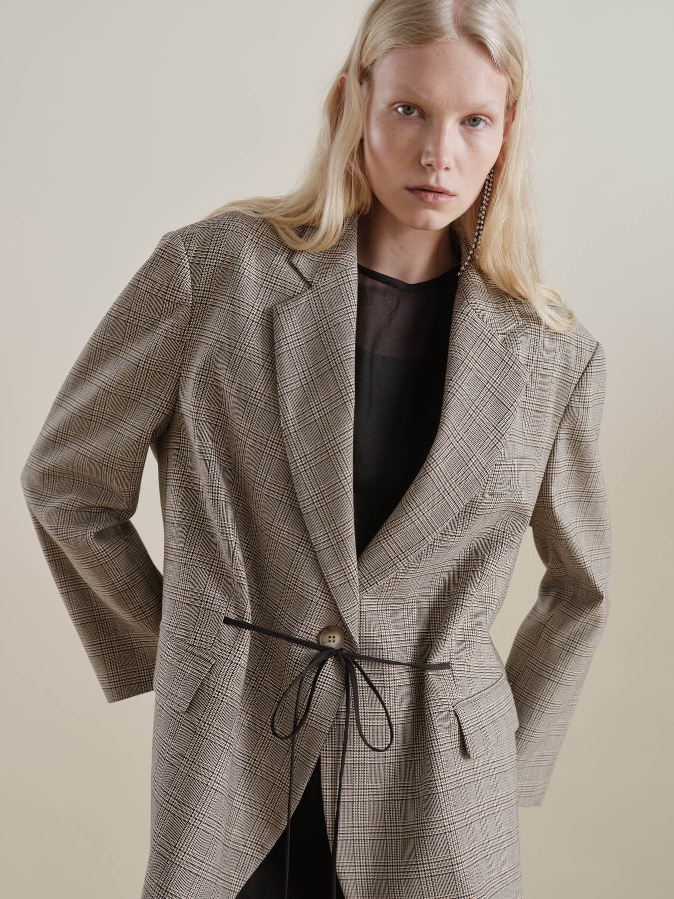 Blazer oversize dal gusto maschile in tessuto check. Monobottone con cinturino sottile che rende possibile sottolineare il punto vita.
