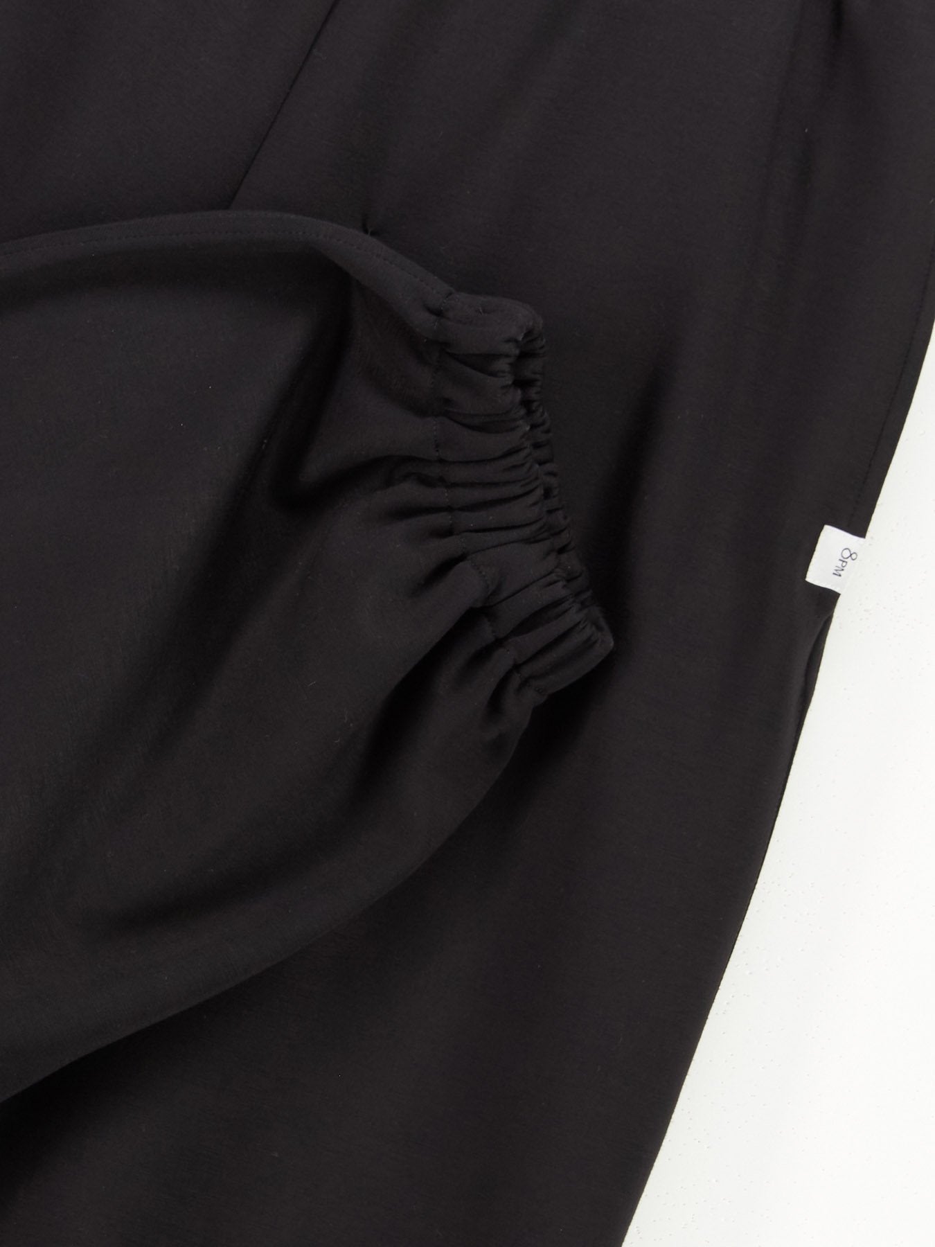 Pantalone in tessuto tuta scuba modello oversize con elastico in vita e sulla parte finale. Vestibilità comoda, due tasche laterali.
