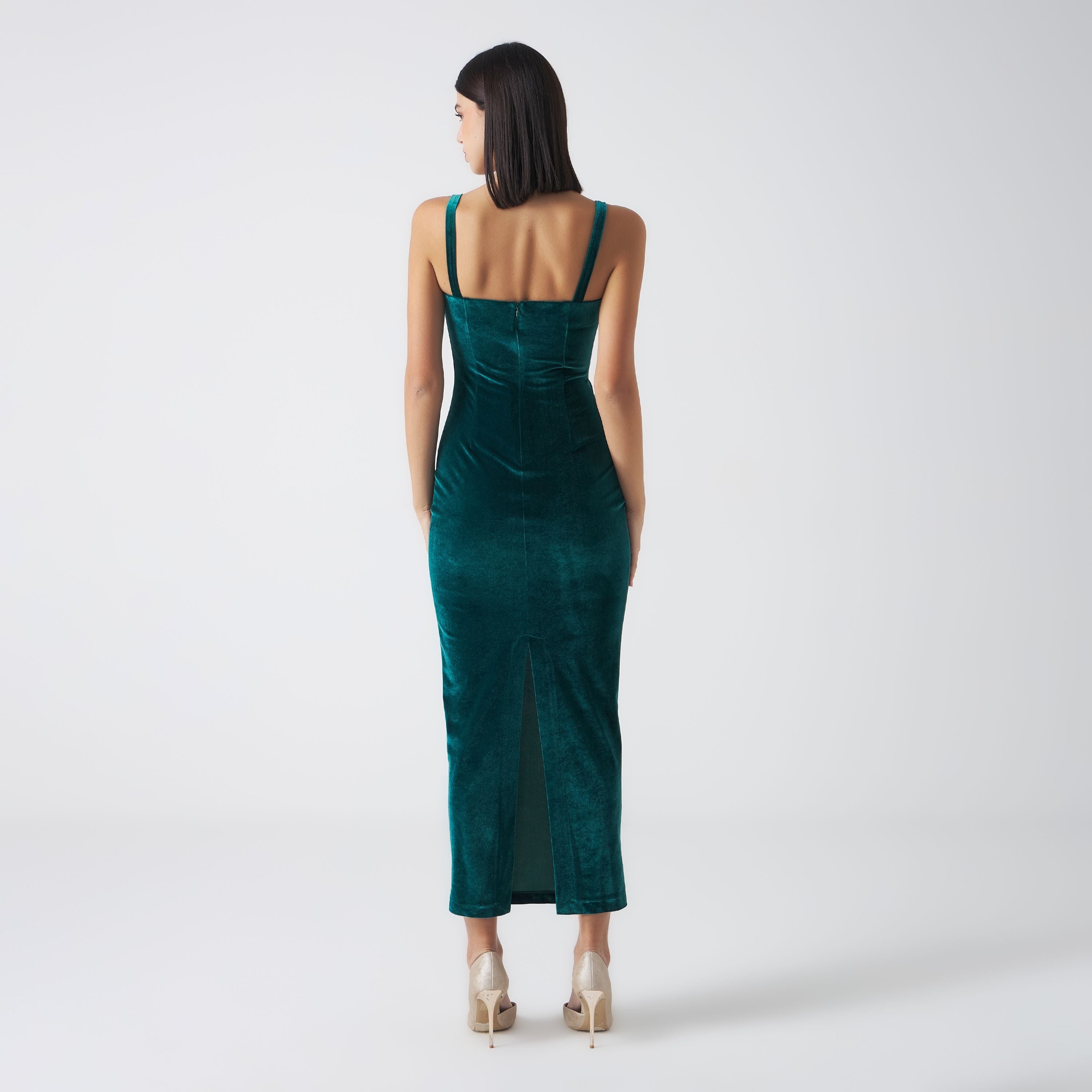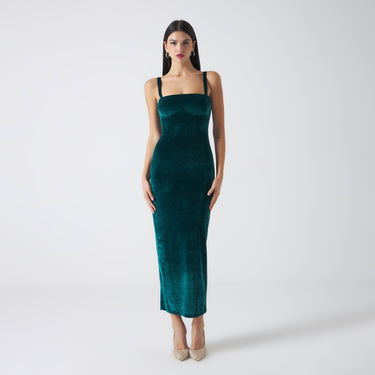 Abito midi in velluto con spalline in stile corsetto sulla parte del seno. Apertura con zip invisibile sul retro e spacco finale.