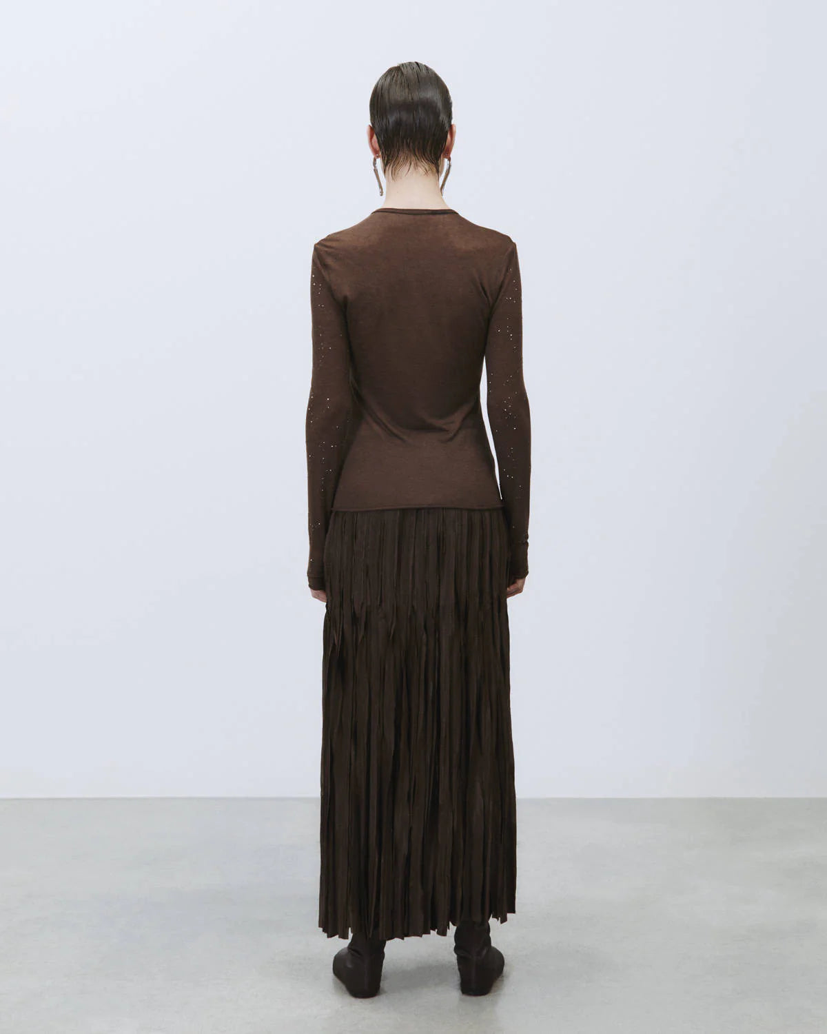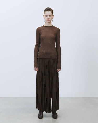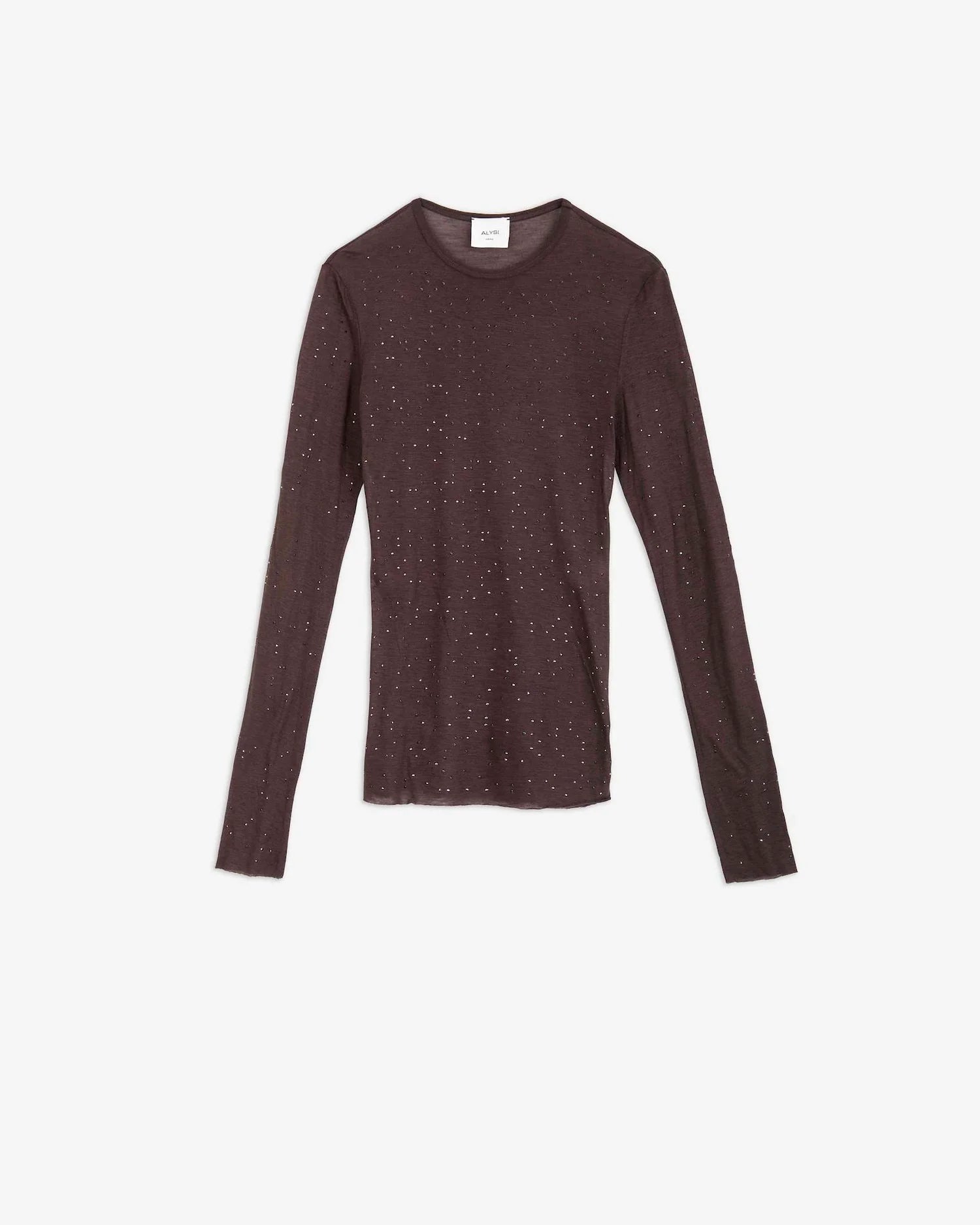 Maglia in jersey di lana manica lun ga con applicazione di cristalli sul davanti. Vestibilità aderente, super comoda.