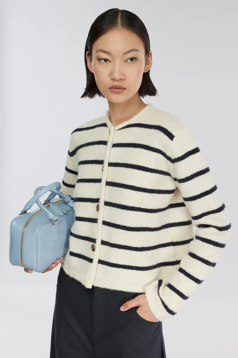 Cardigan in misto alpaca con fantasia a righe e abbottonatura centrale. Maniche lunghe e vestibilità regolare, lunghezza alla vita.