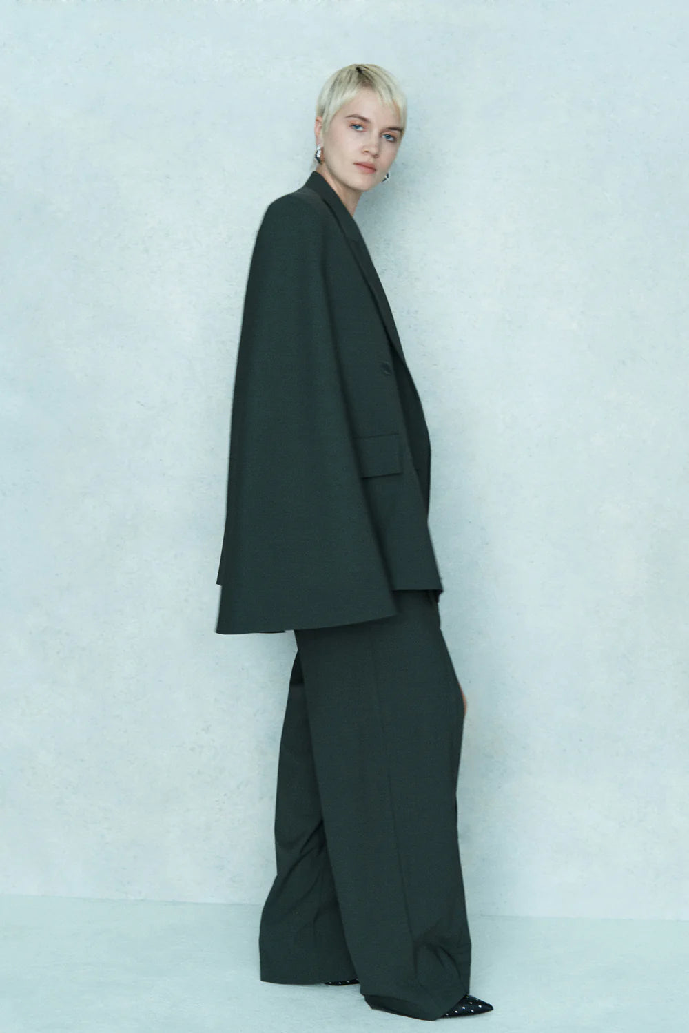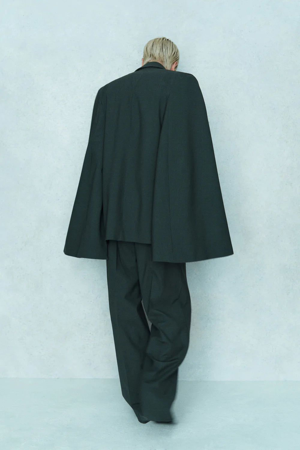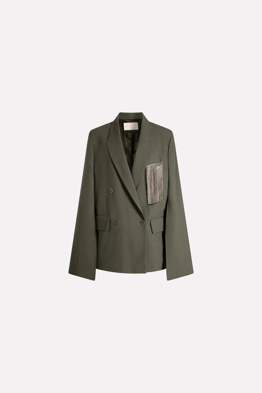 Blazer oversize doppiopetto dal taglio maschile con particolare dettaglio cascata swarovsky sul taschino davanti. Maxi maniche ampie con apertura, vestibilità comoda, lunghezza sotto al bacino.