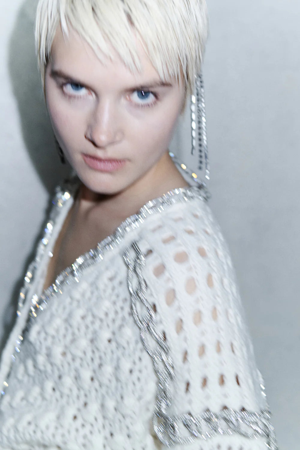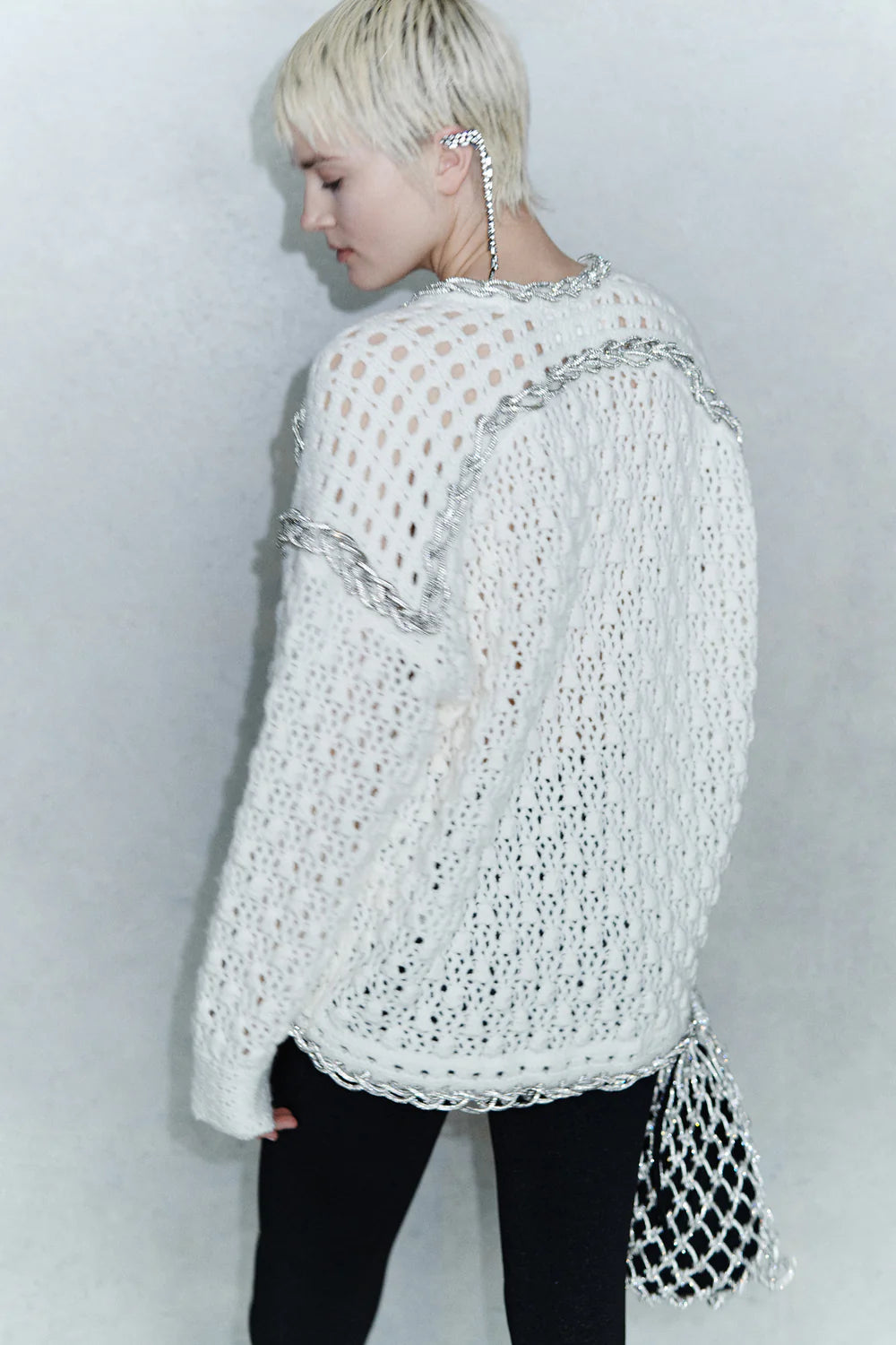 Cardigan traforato oversize con manica scesa. Particolarità della catena strass.Vestibilità ampia e bellissimo abbinato al suo pantalone.