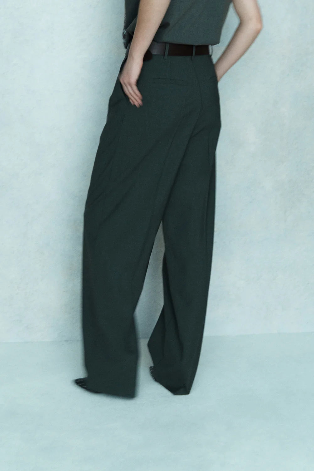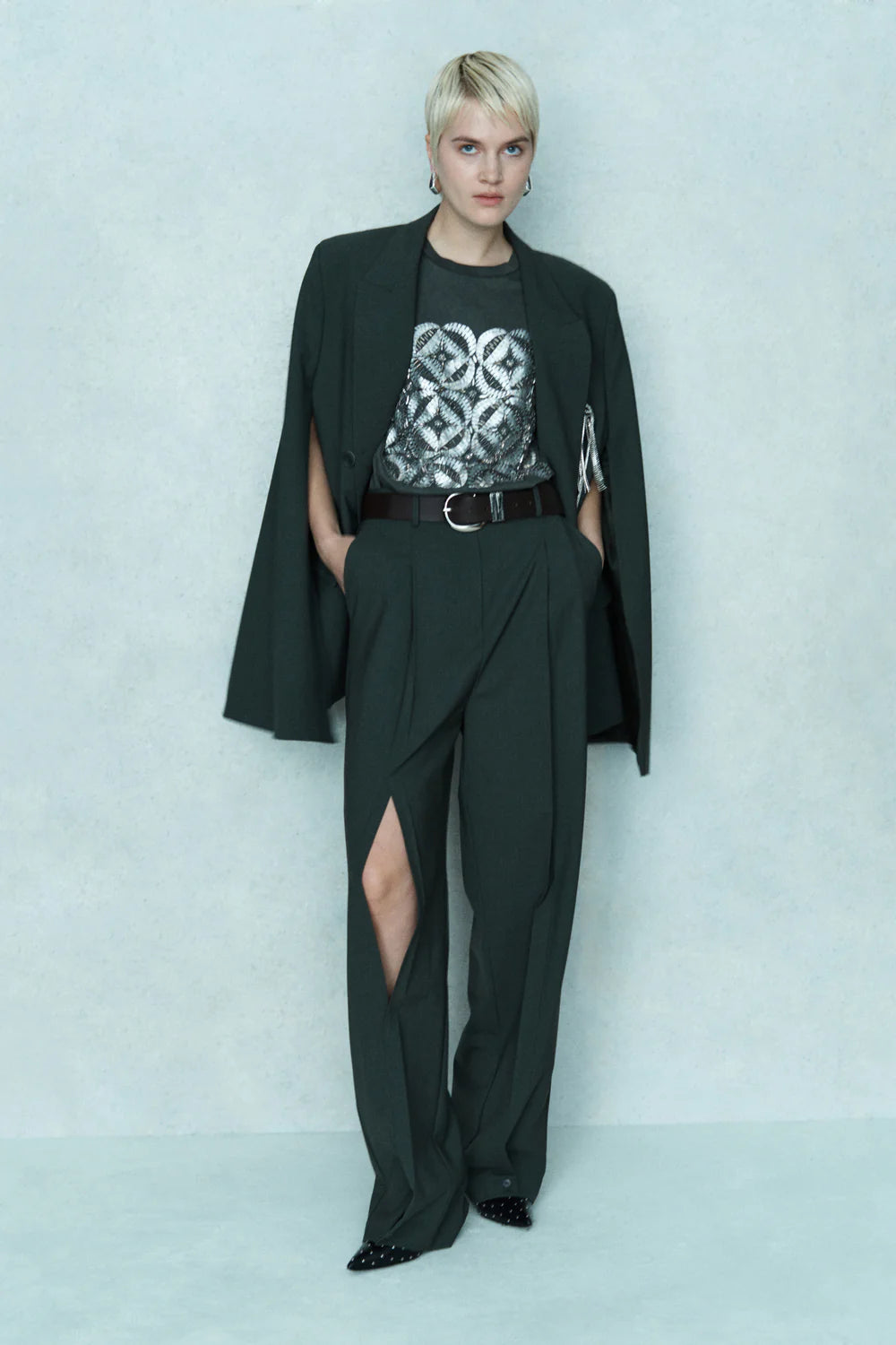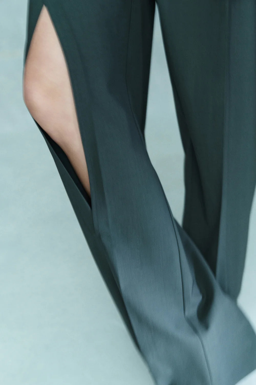 Pantalone in lana sartoriale, vita alta con gamba dritta. Particolarità del taglio cut out sulle ginocchia. Vestibilità morbida e dritta sulla gamba.