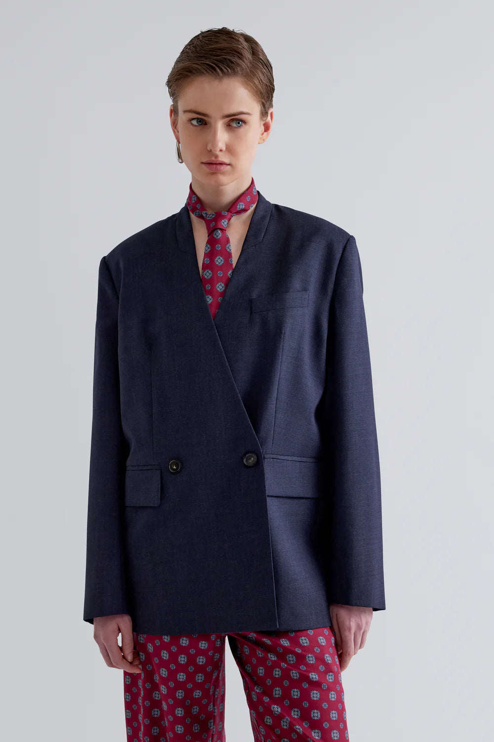 Giacca oversize a doppio petto con scollo a V profondo. Particolarità della cravatta. Spalloni inseriti, vestibilità comoda dal gusto maschile. Bellissima abbinata al suo pantalone.