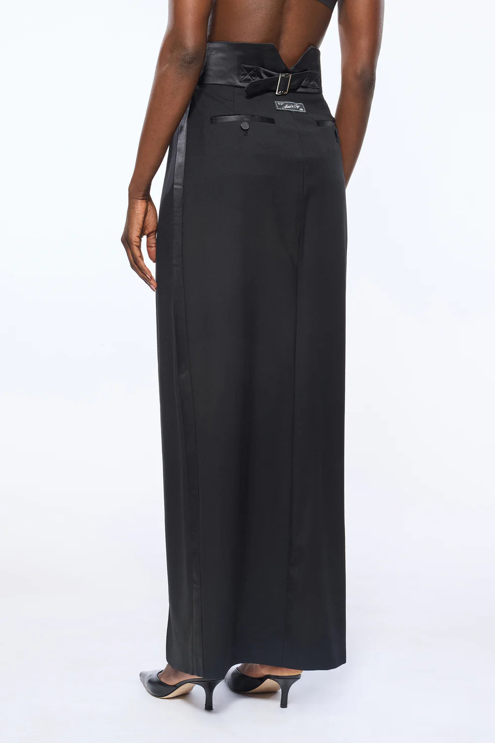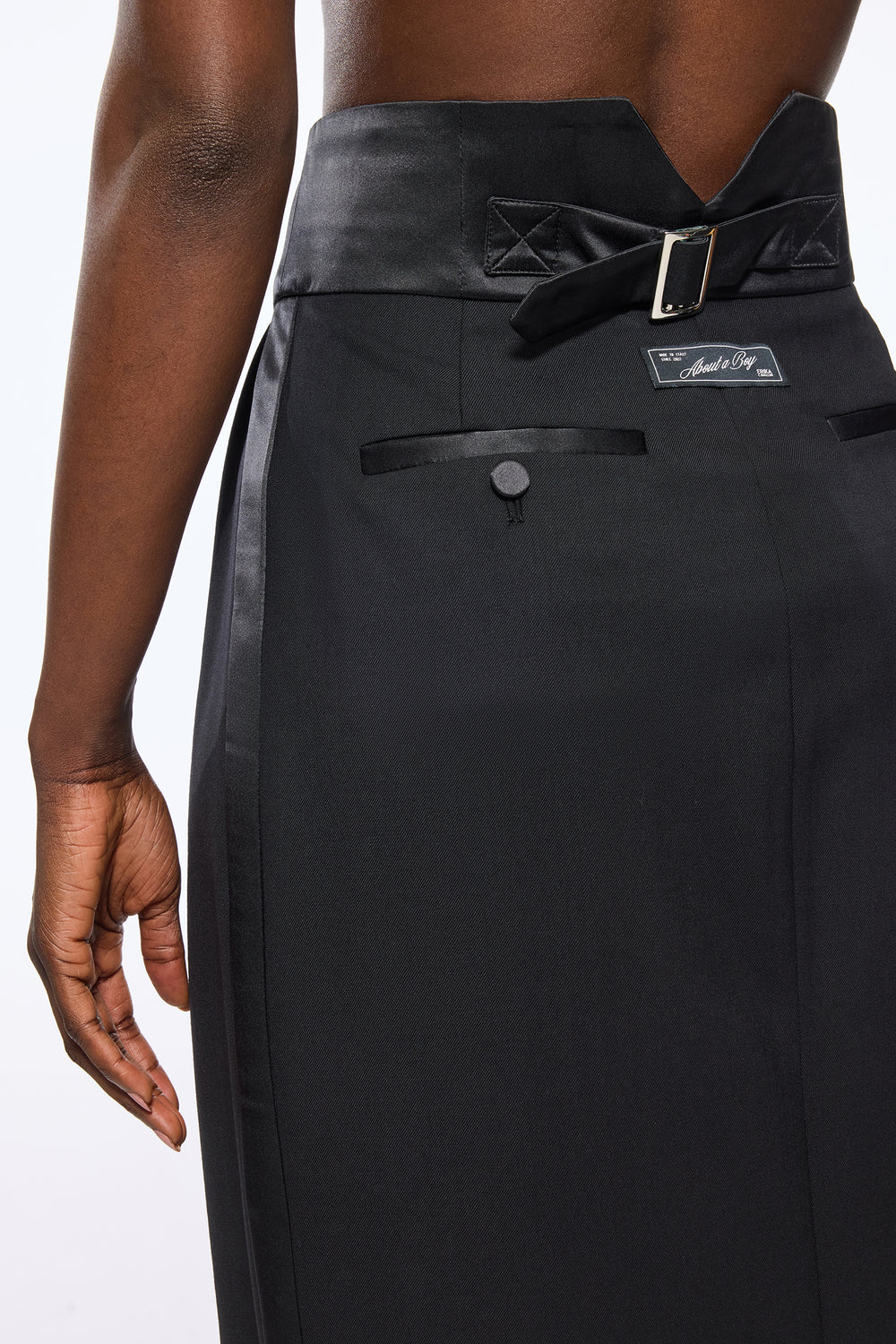 Gonna lunga stile tuxedo in fresco di lana con cintolo in vita di raso. Chiusura a portafoglio incrociata con due bottoni laterali e profondo spacco davanti. Vestibilità comoda, stretto in vita.