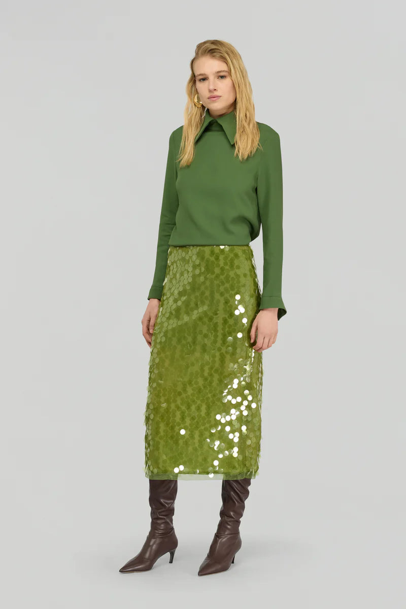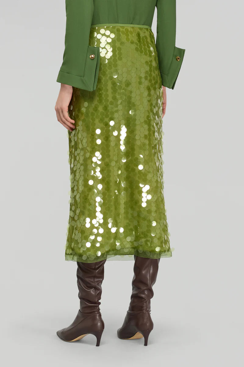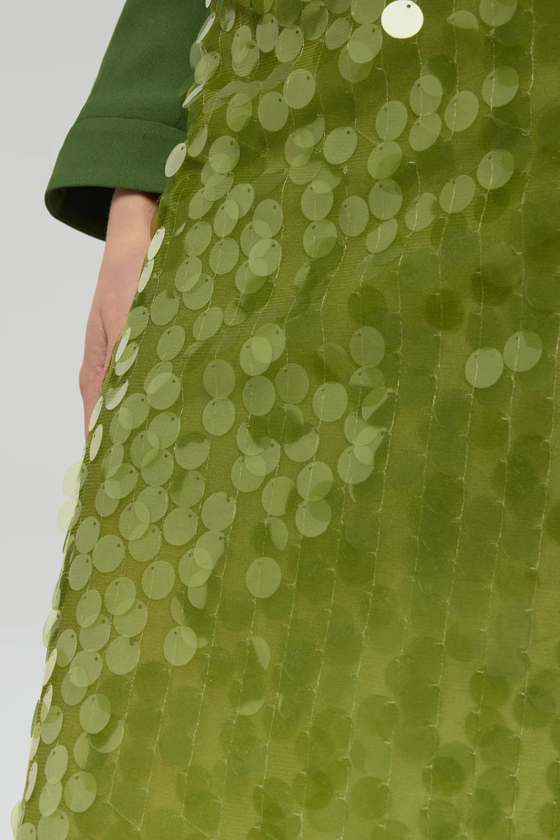 Gonna midi a maxi paillettes semi trasparenti tono su tono. Vestibilità appoggiata, elastico in vita. Lunghezza a metà polpaccio (disponibile anche variante NERO).