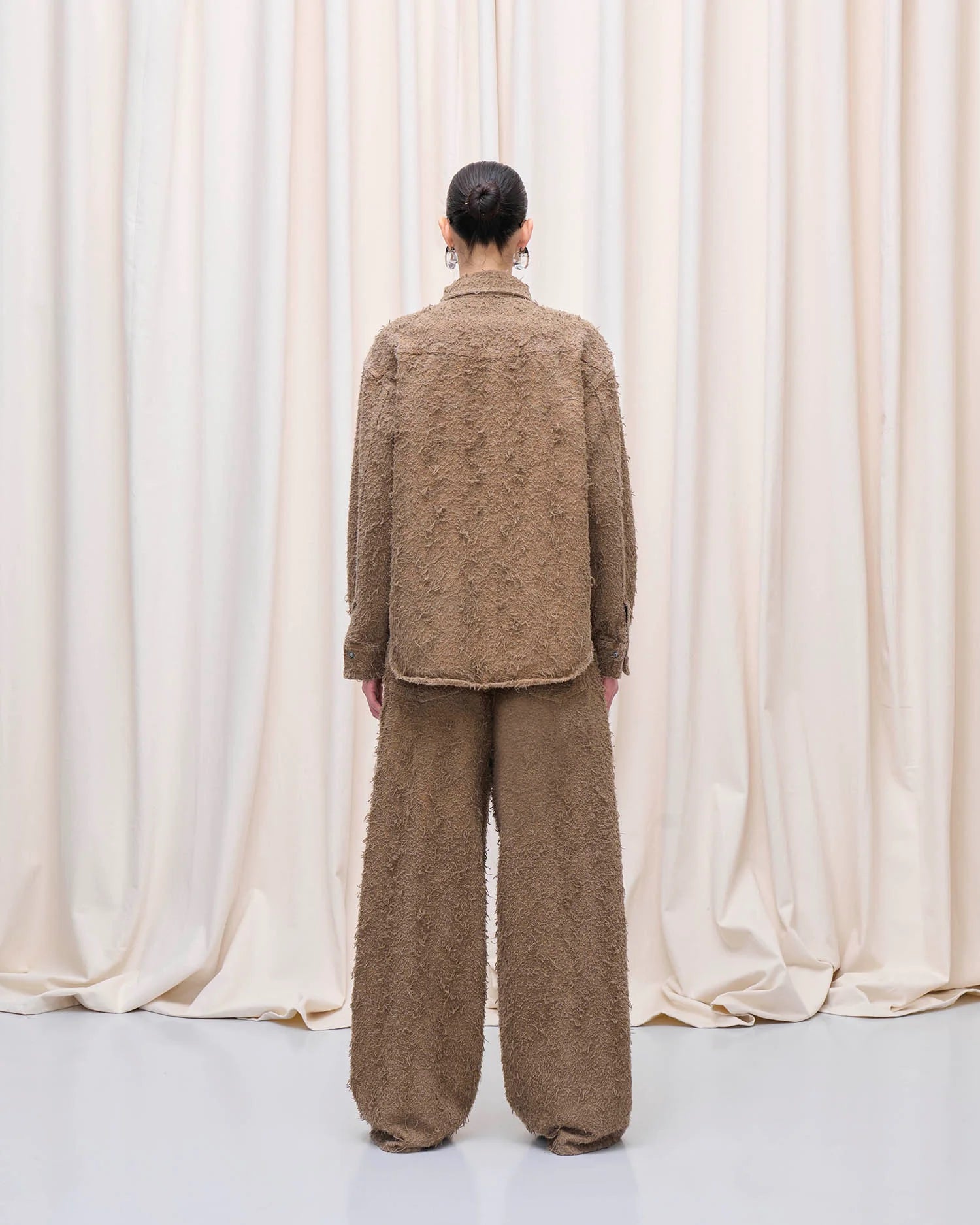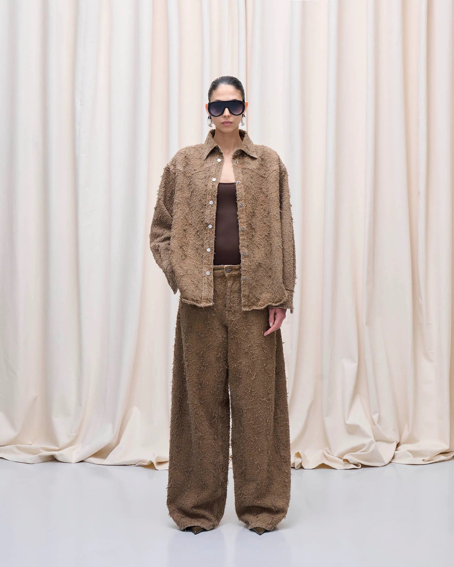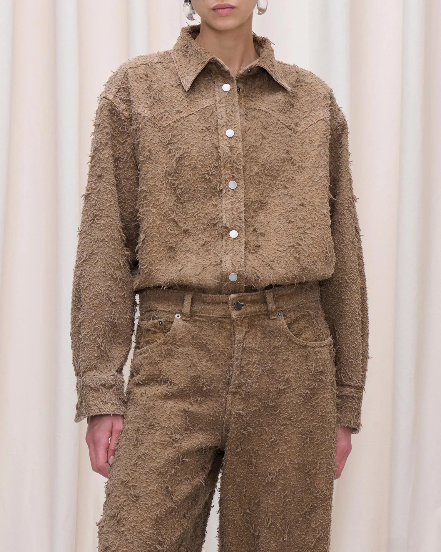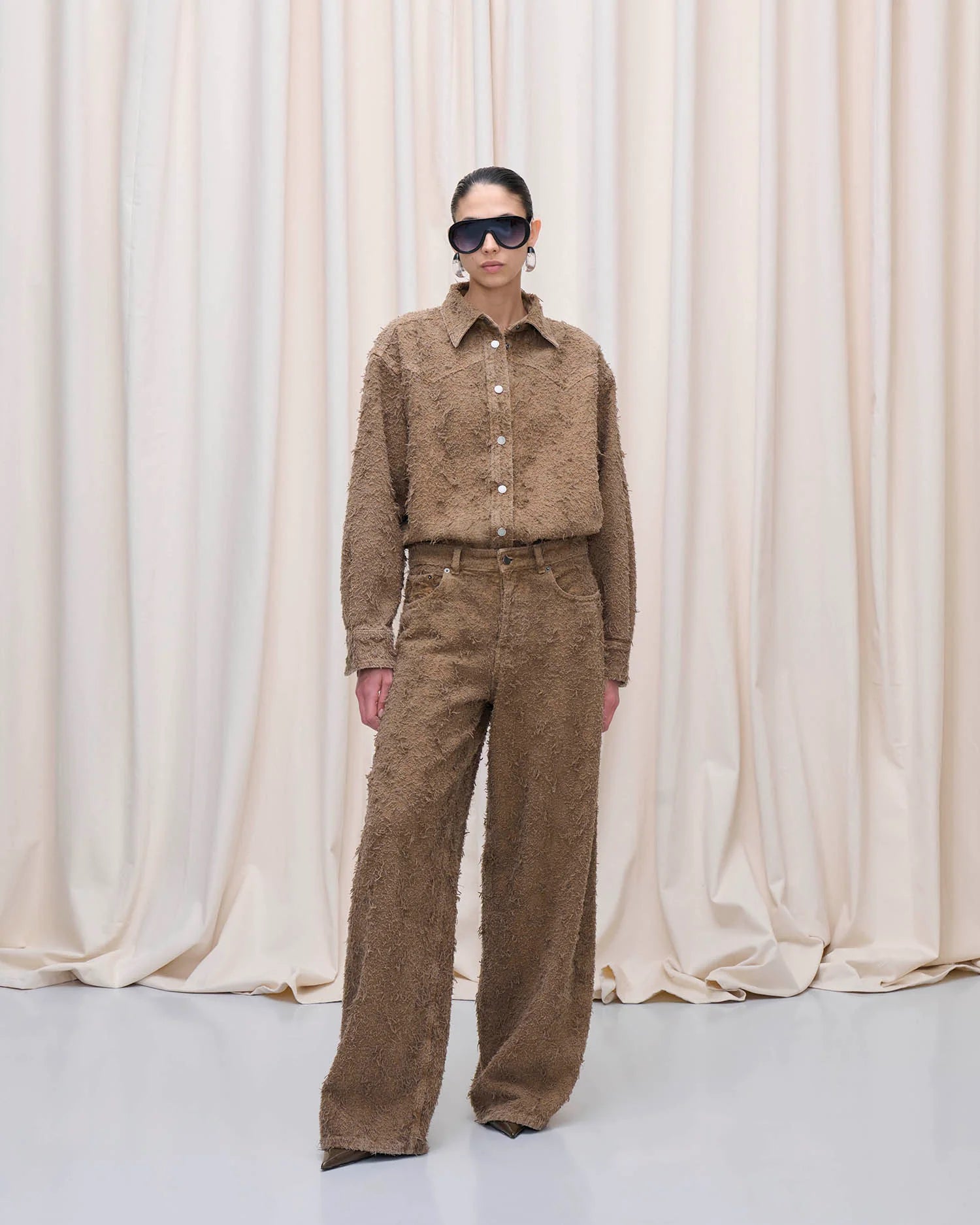 Camicia jeans in denim colorato color cammello. Trattamento stile pelliccia, super confortevole ed esclusivo. Vestibilità oversize, bellissima da portare abbinata al suo denim.
