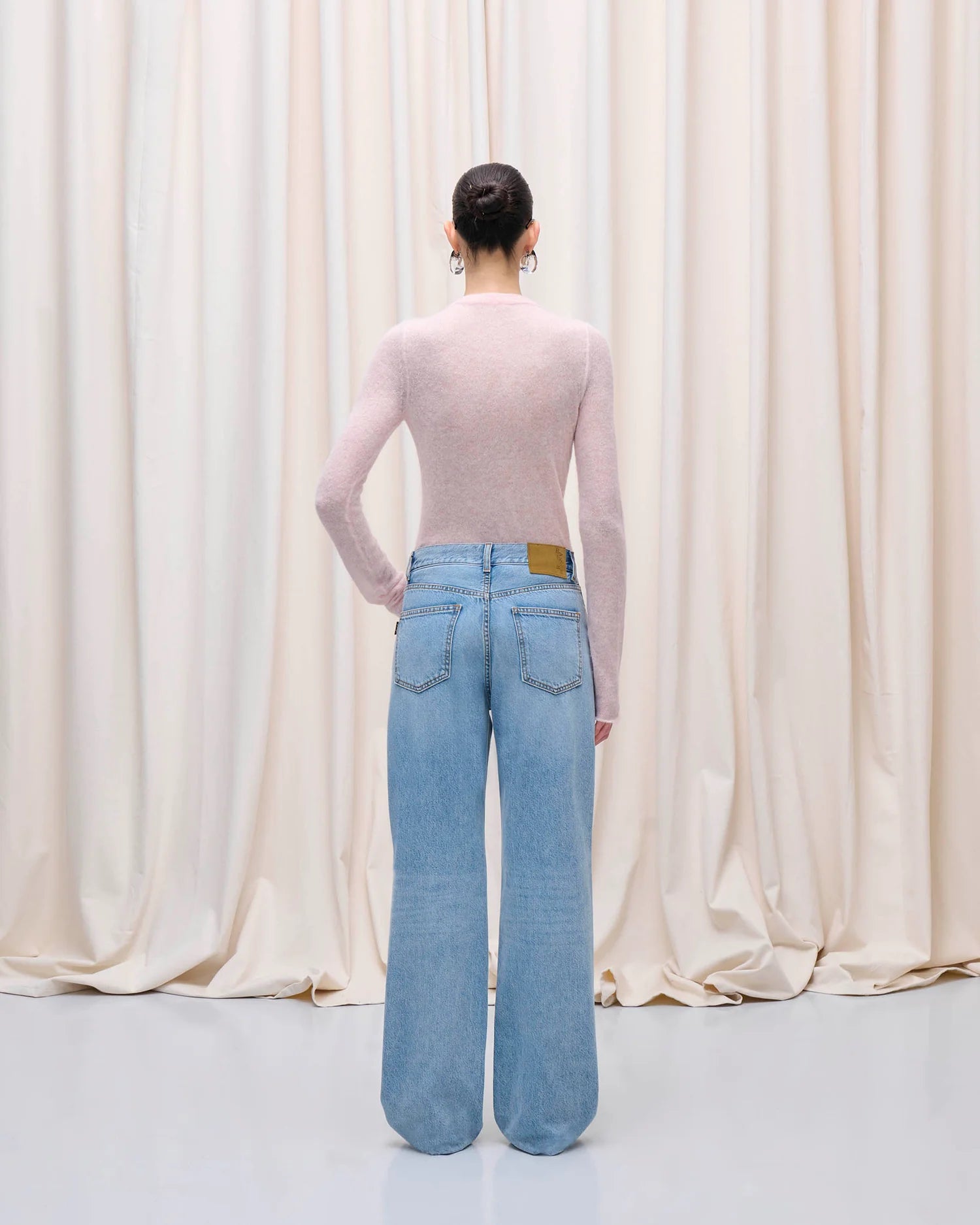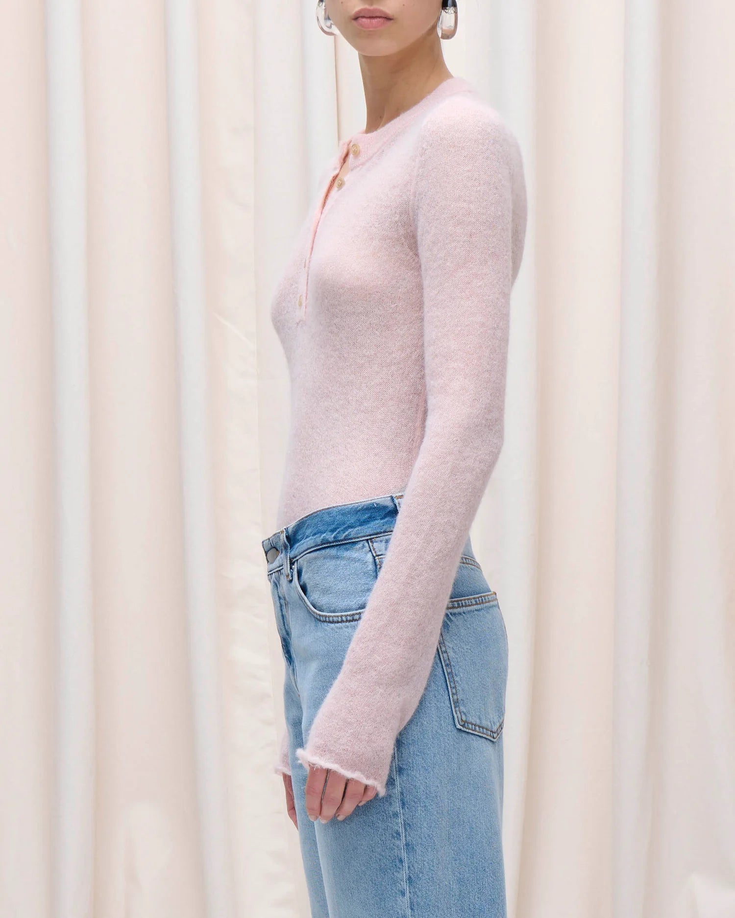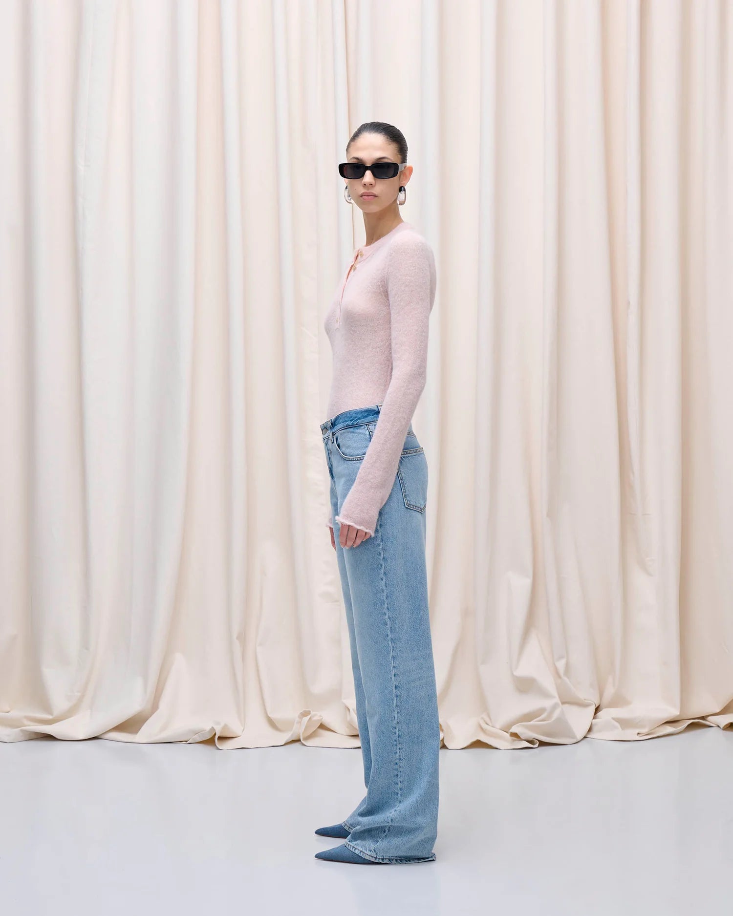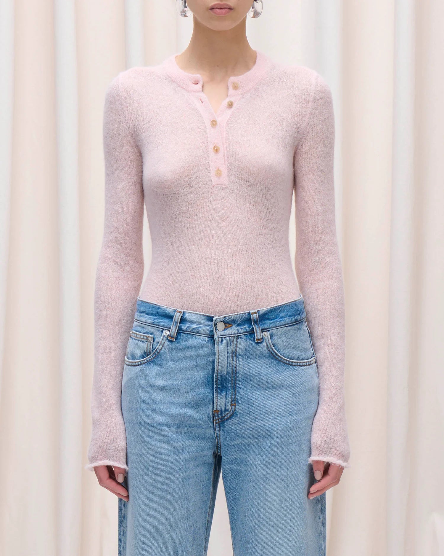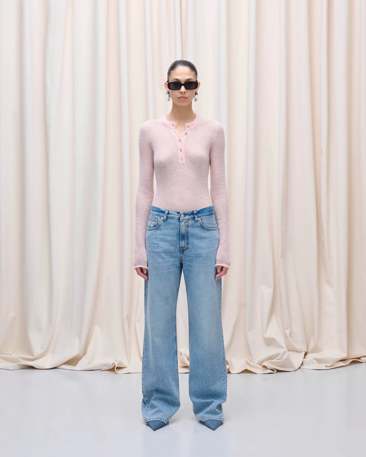 Body girocollo in maglia sottilissima con bottoncini frontali. Manica lunga, vestibilità aderente.