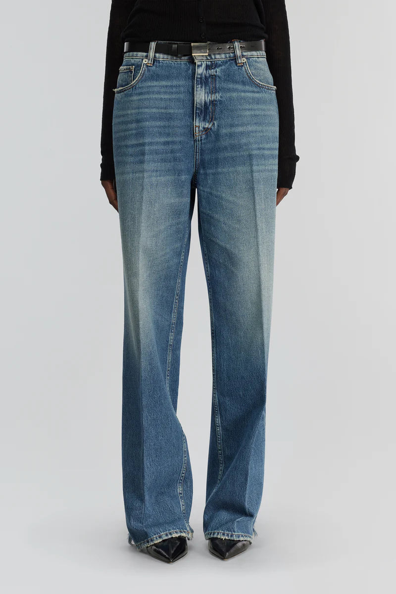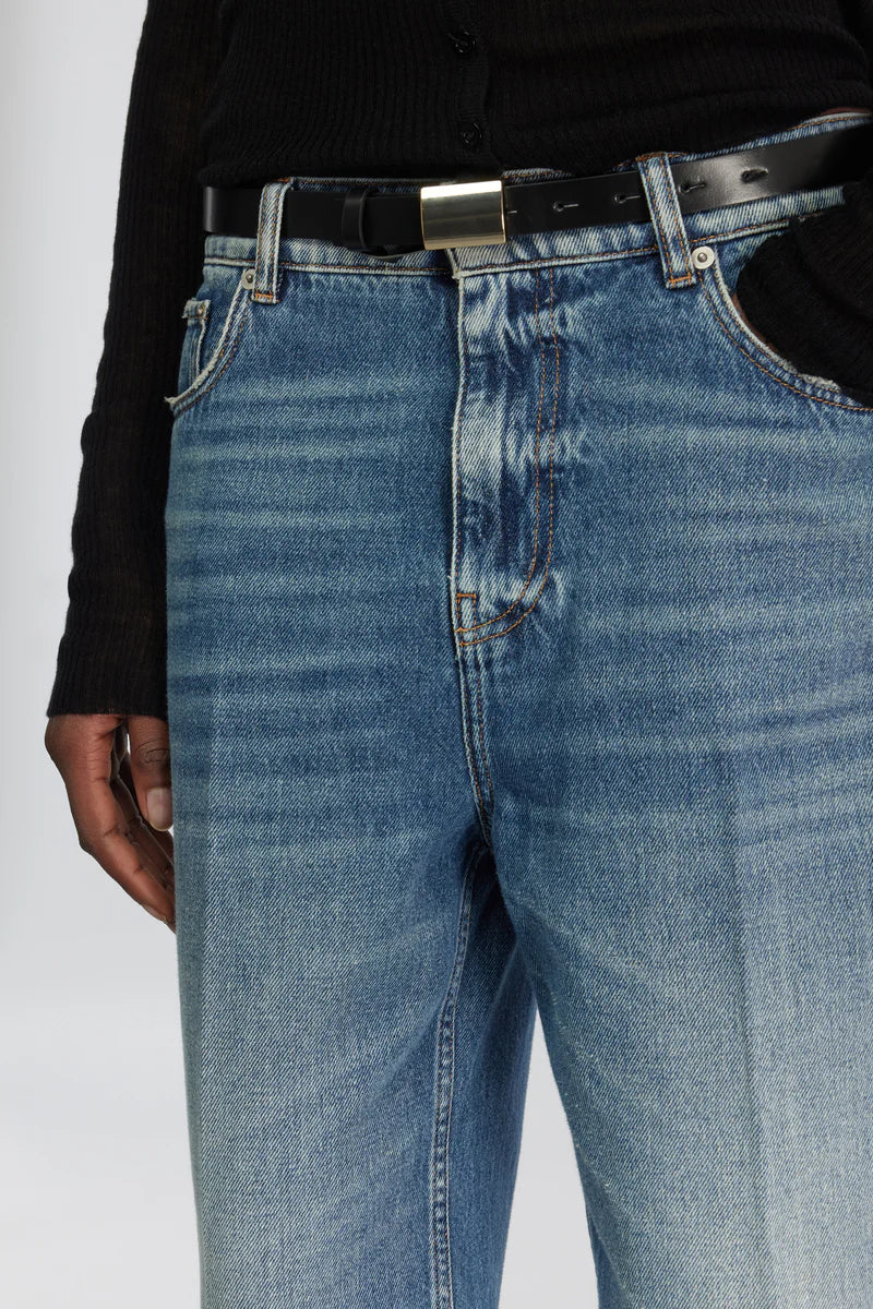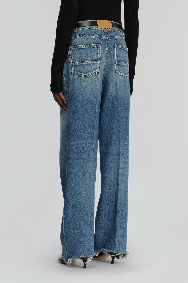 Jeans cinque tasche con gamba dritta a vita alta. Leggermente slavato sulle ginocchia e vestiblità regolare. Particolarità sul finale della gamba dietro tagliato e sfrangiato.