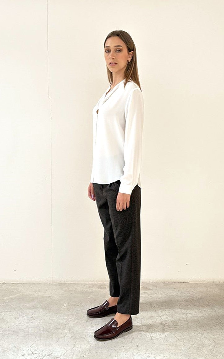 Camicia girocollo con bottoncini fasciati a gruppi di tre. Vetsibilità morbida, stondatura sul finale, lunghezza sotto la vita.