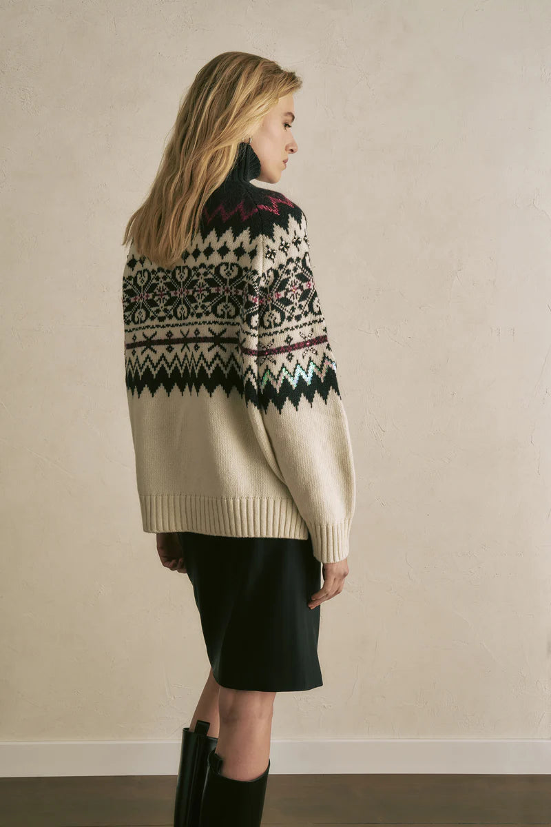 Maglione collo alto in fantasia jacquard, maniche lunghe raglan con polsini finali. Vestibilità regolare e morbida, lunghezza al bacino.