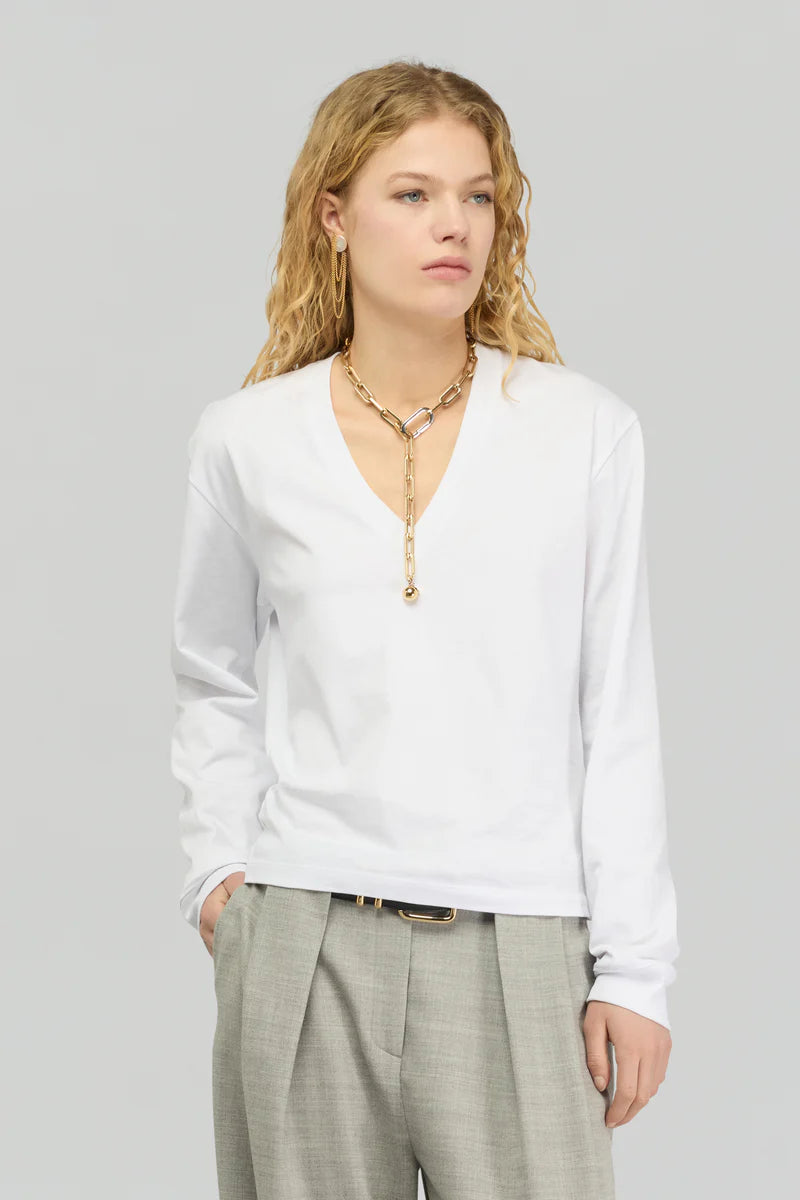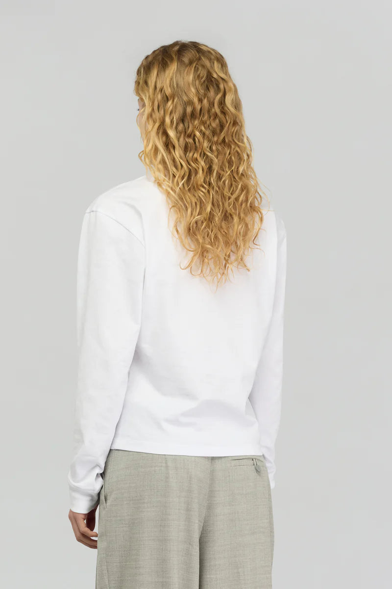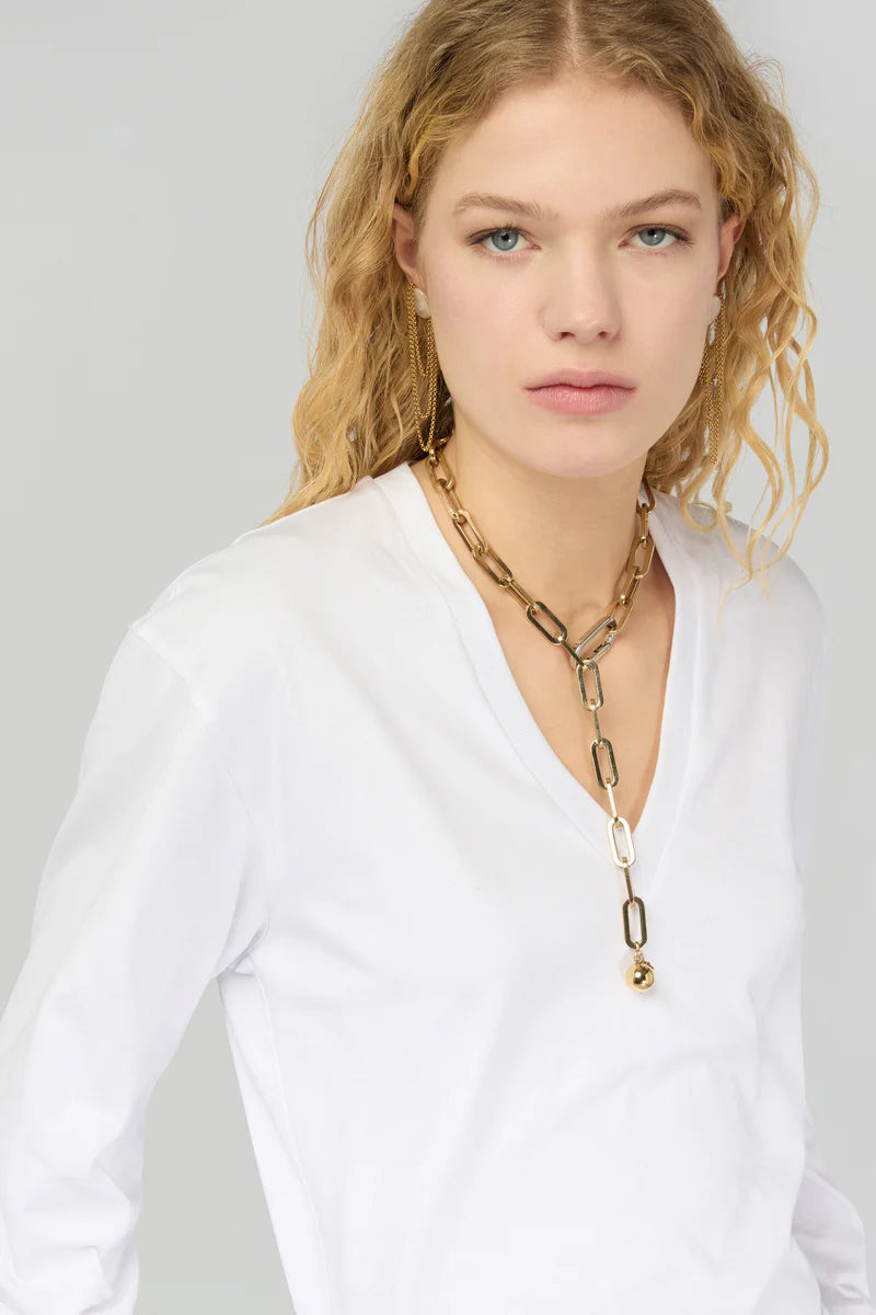 Maglia in cotone a manica lunga con scollo a V. Decoro scritta logo sul lato in tono alla maglia. Vestibilità morbida e regolare.