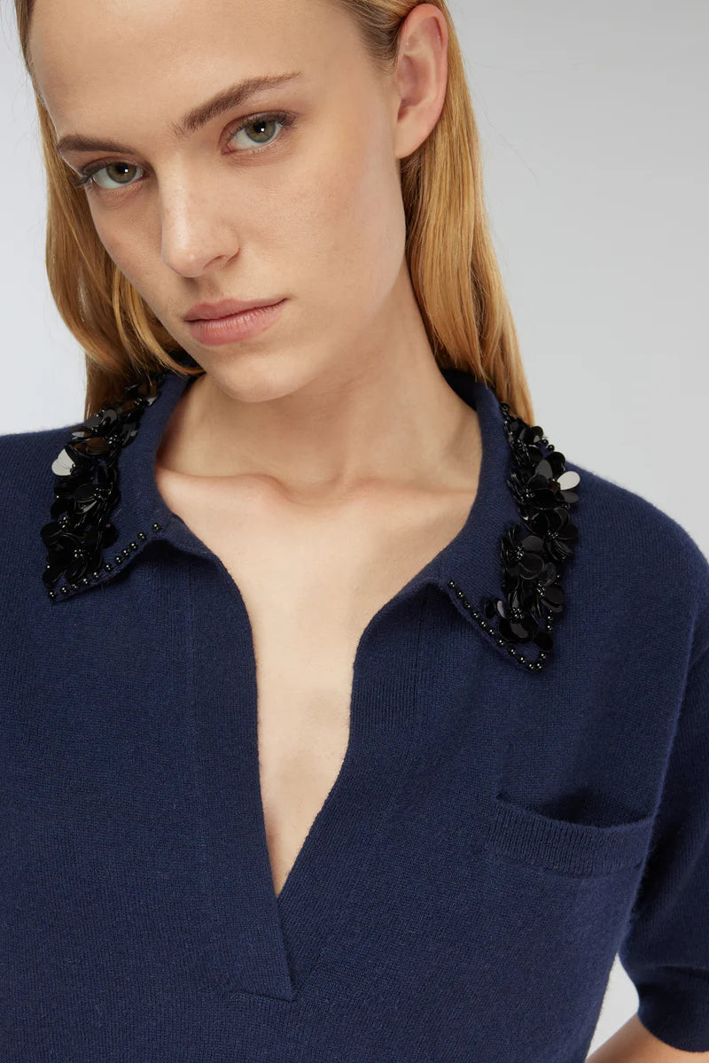 Maglia polo a mezza manica con scollo a V. Dettaglio del colletto in maglia ricamato con perline e paillettes. Vestibilità regolare, lunghezza al bacino.