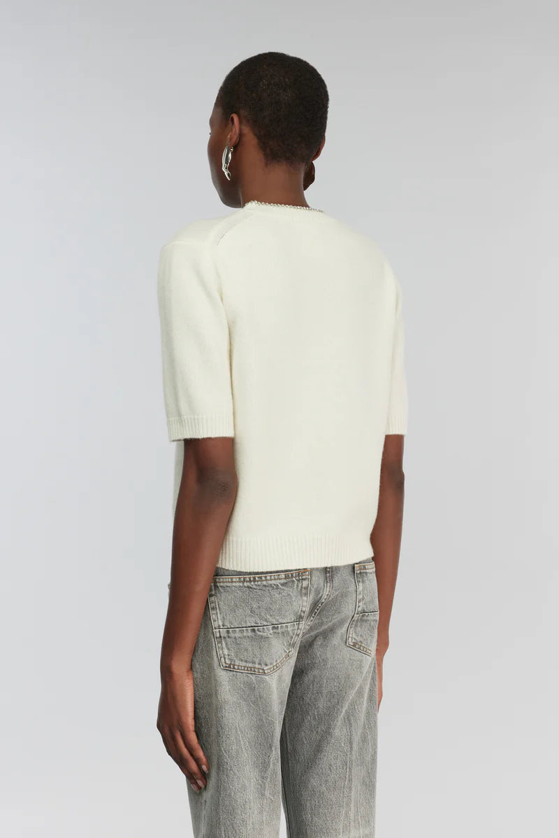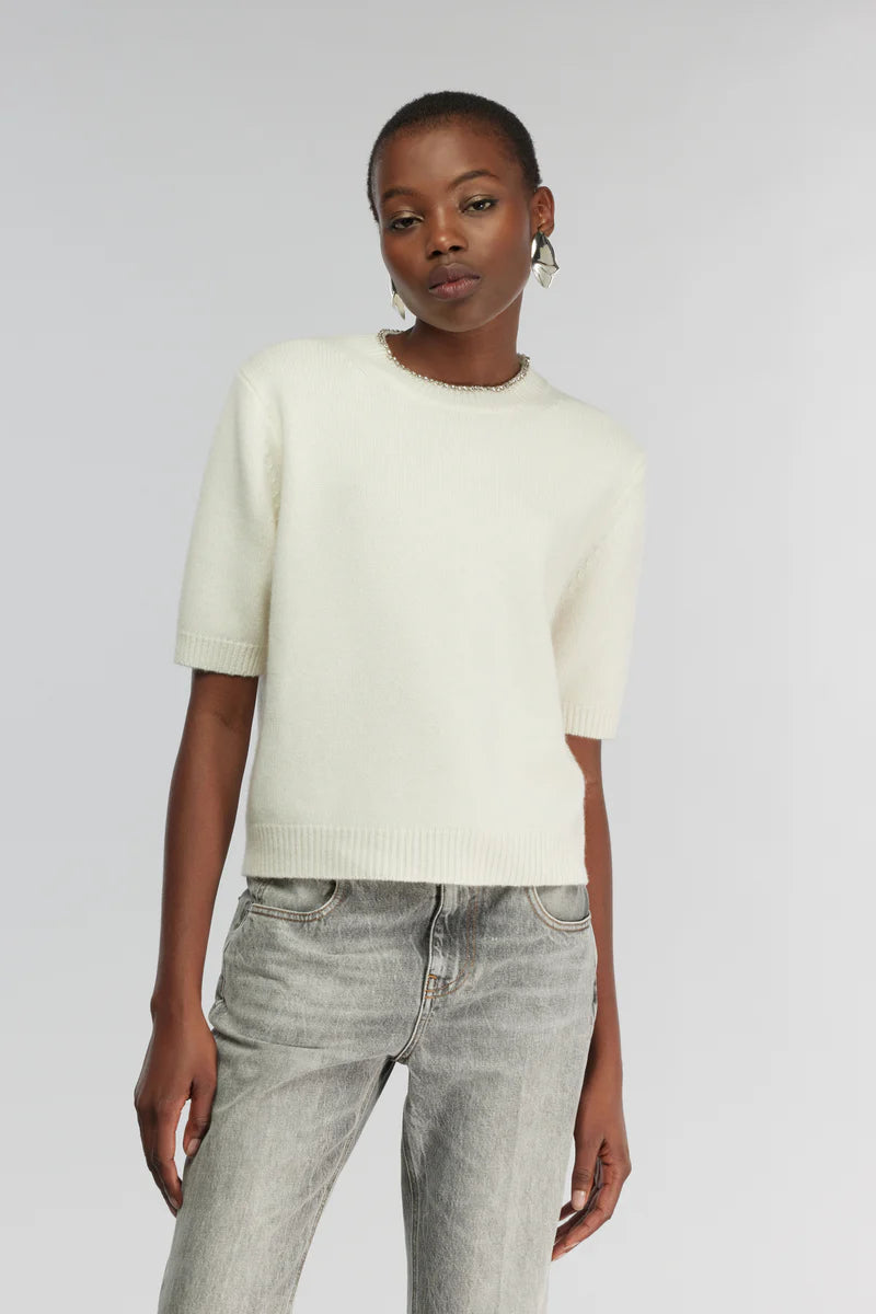 Maglia girocollo a maniche corte misto cachemire con profilature in strass. Vestibilità regolare, lunghezza ai fianchi.