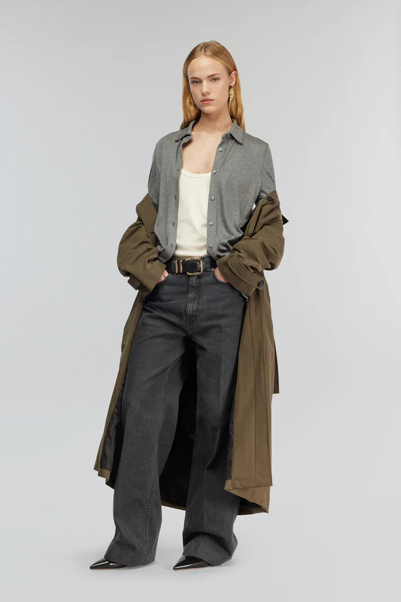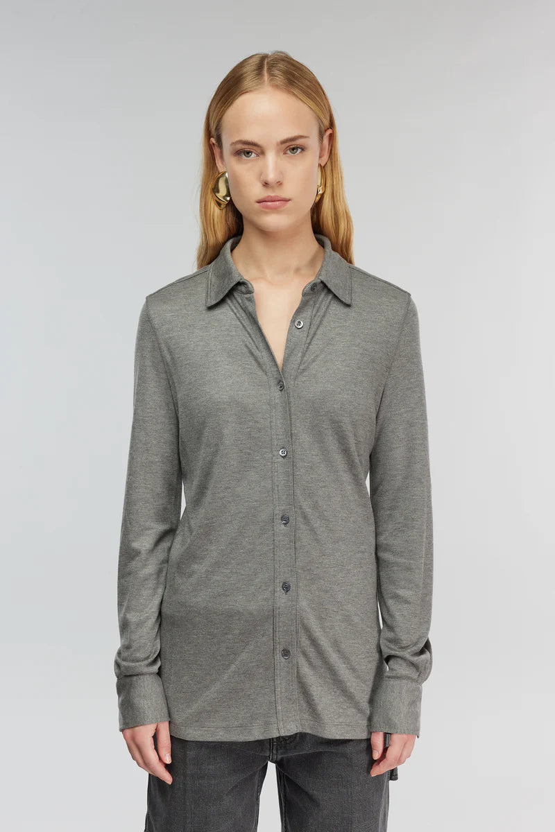 Camicia jersey con colletto classico polo e bottoncini frontali. Vestibilità aderente, lunghezza al bacino.