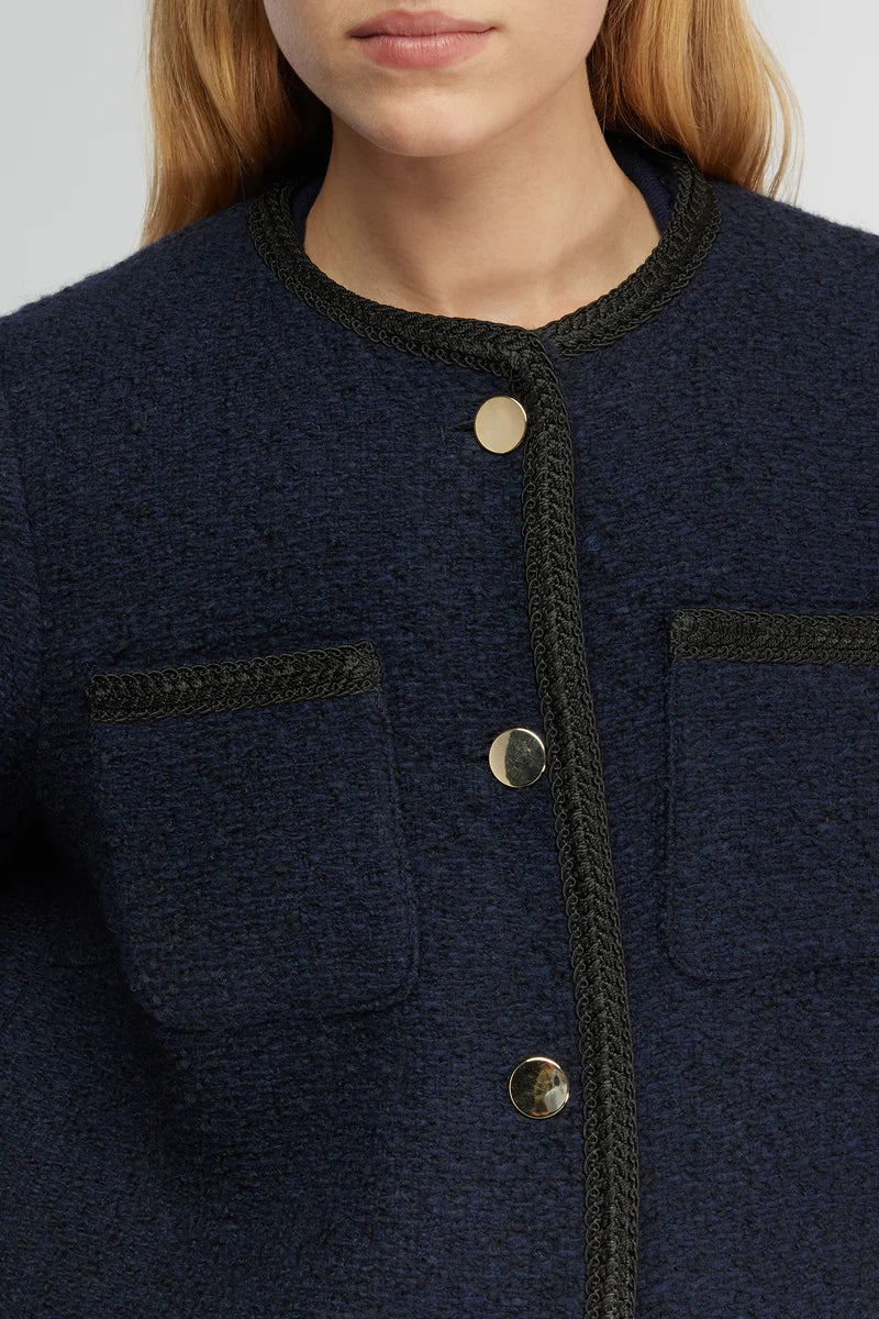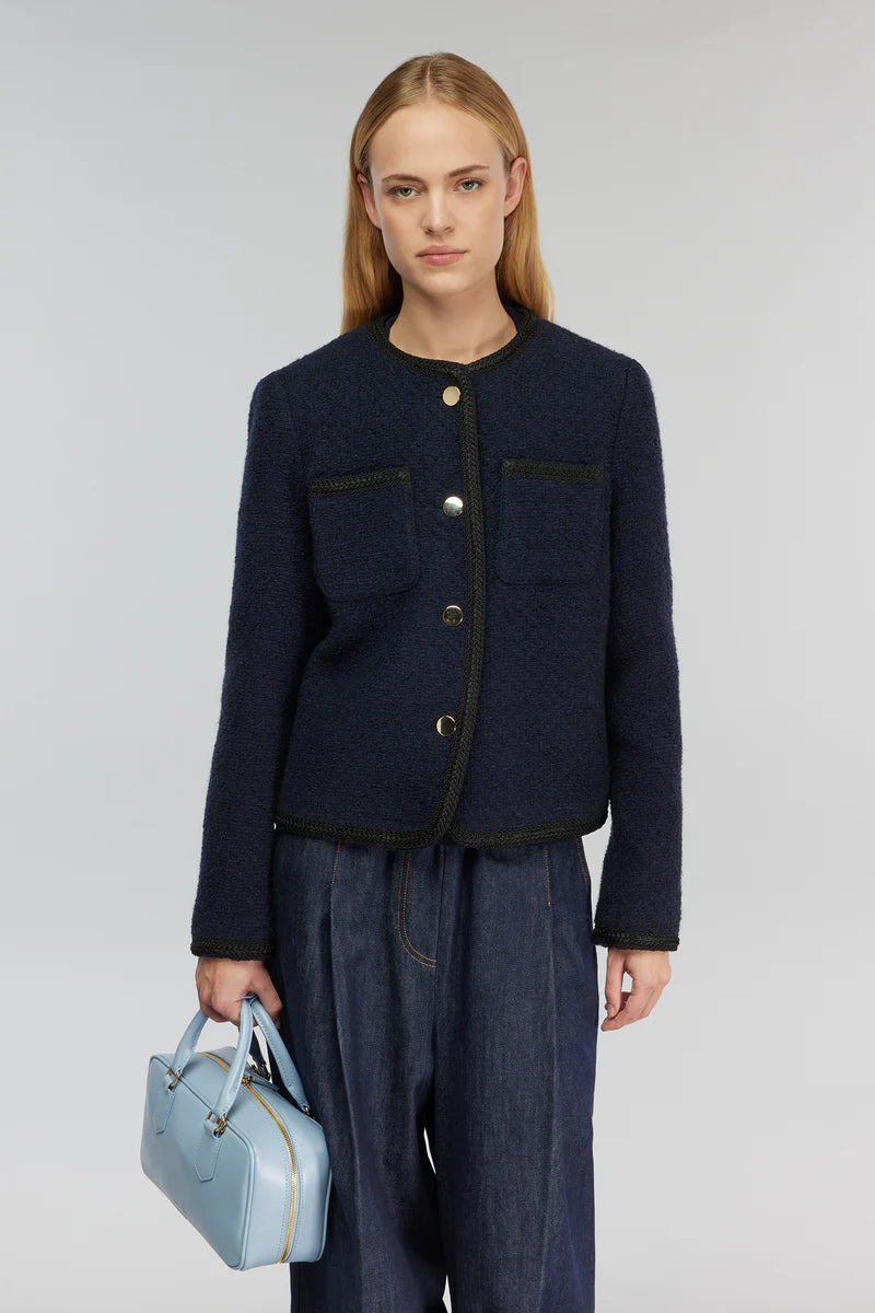 Giacca in tweed girocollo misto lana con abbottonatura sul davanti. Vestibilità regolare e lunghezza alla vita. Bordature in passamaneria nera.