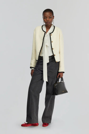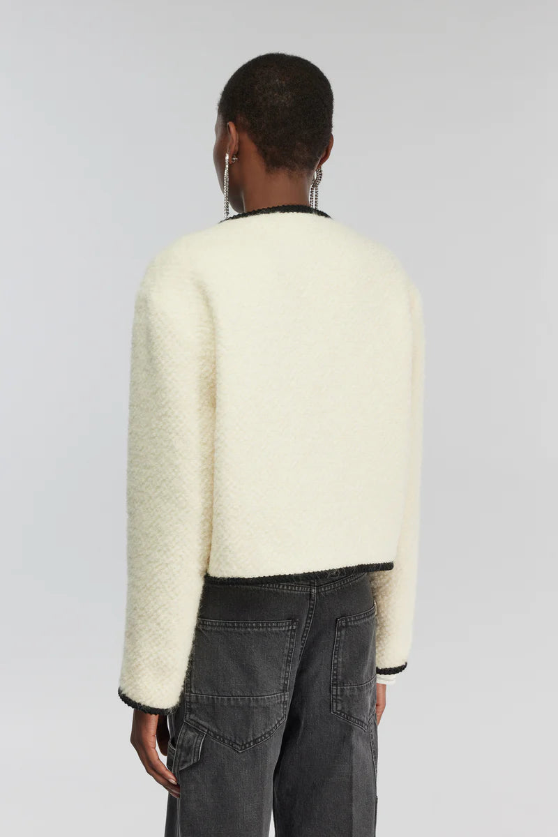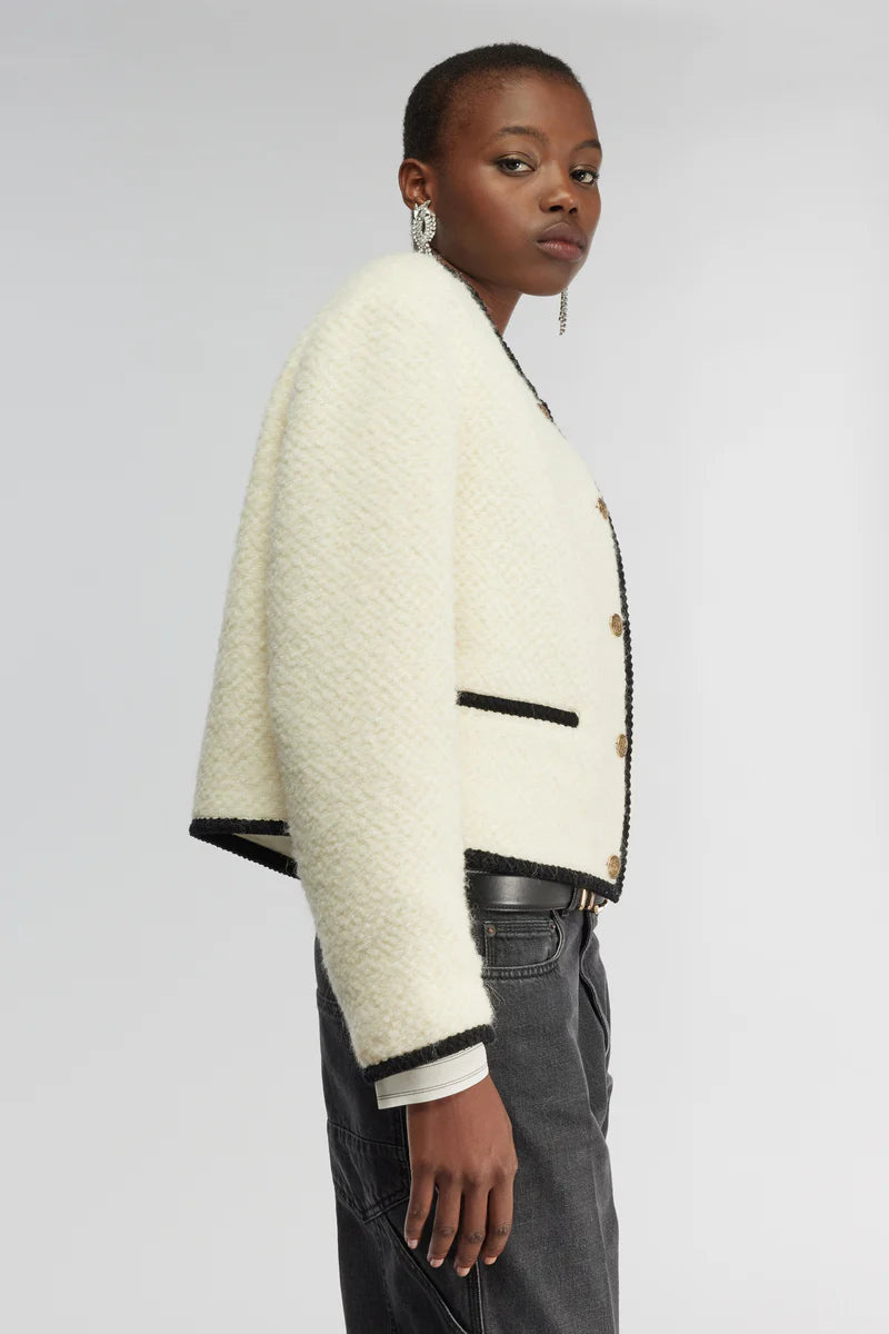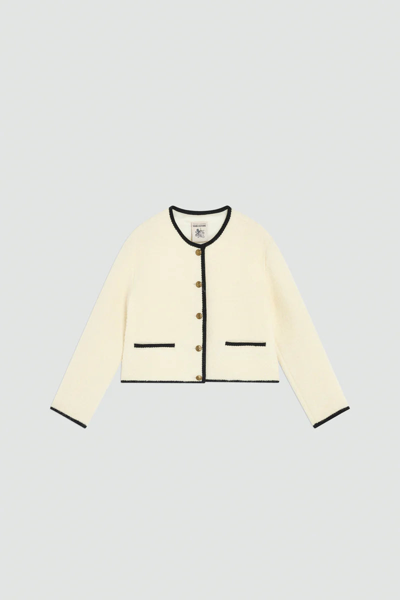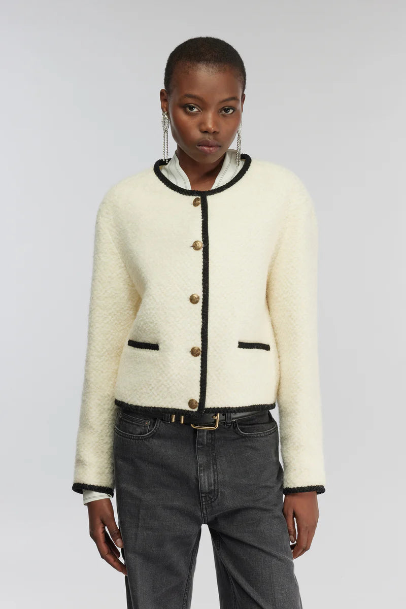 Giacca in tweed di lana girocollo con abbottonatura sul davanti. Vestibilità regolare e lunghezza alla vita. Cordature a contrasto con passamaneria nera.