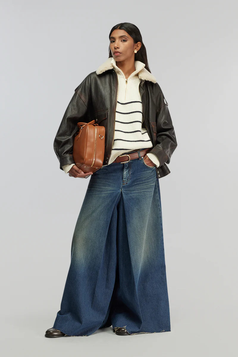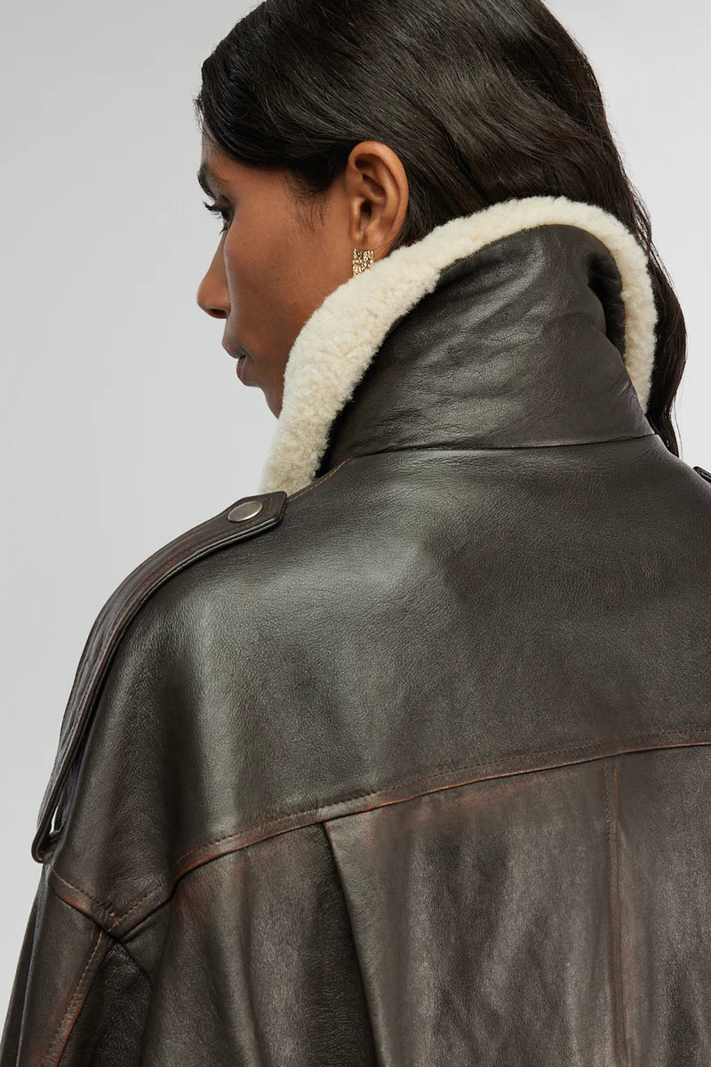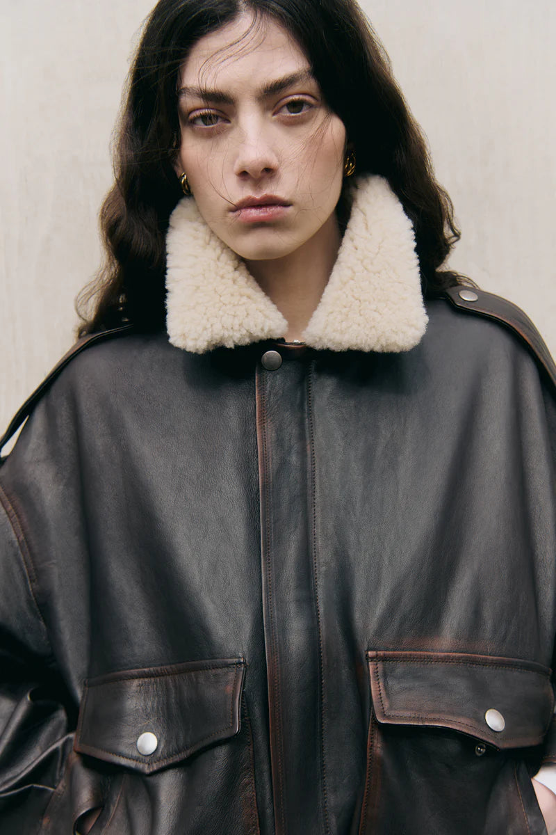 Bomber in vera pelle color cioccolata, zip frontale con patta e tasche con bottoni automatici. Colletto in eco montone ed elastico finale. Vestibilità comoda, lunghezza sotto la vita.