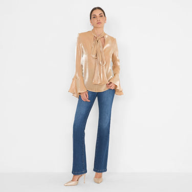 Blusa in tessuto semi lucido con nastro sciarpa sul collo eprofonbda scollatura V. Maxi rouches sulla parte finale della manica, lunghezza ai fianchi, vestibilità comoda (disponibile variante colore NERO).