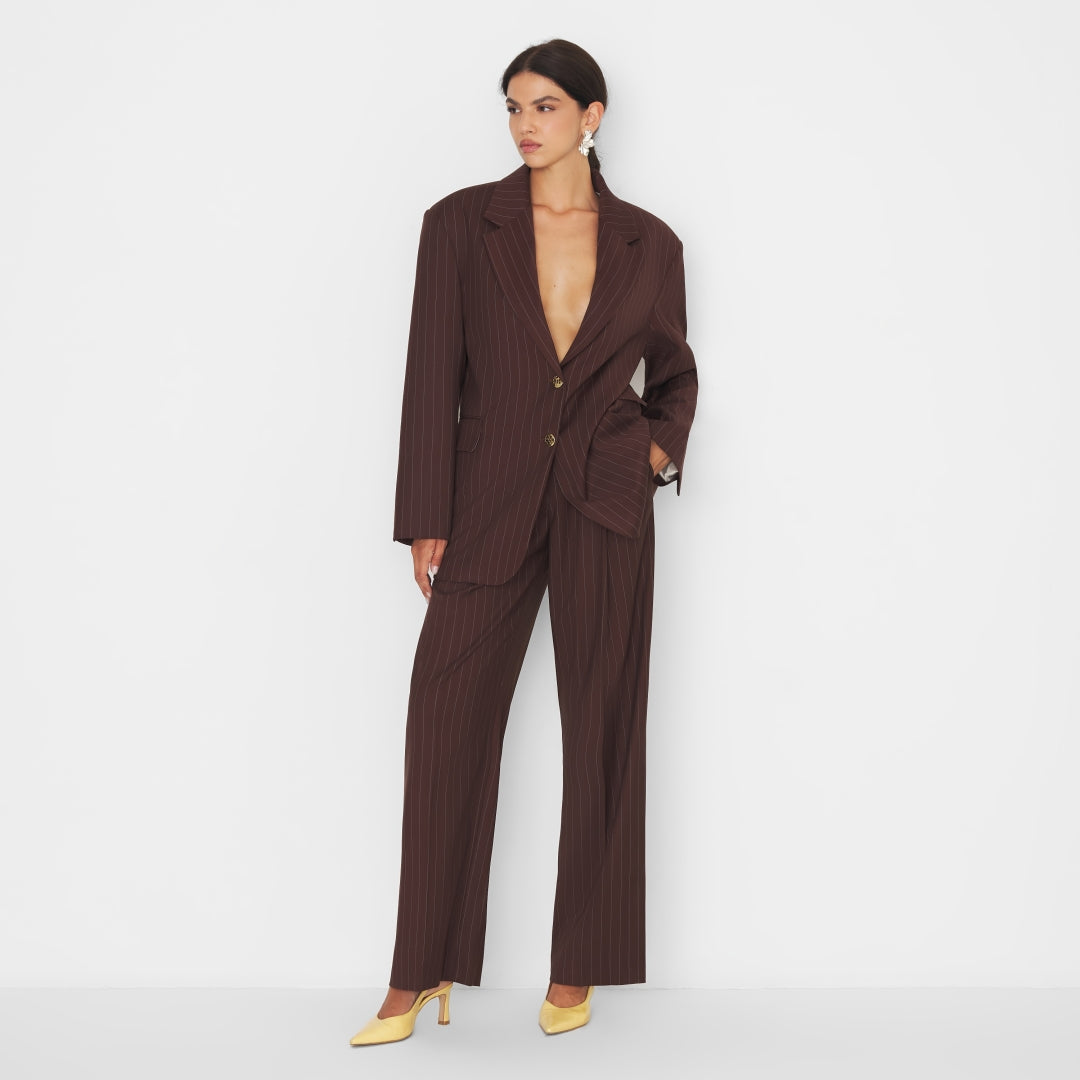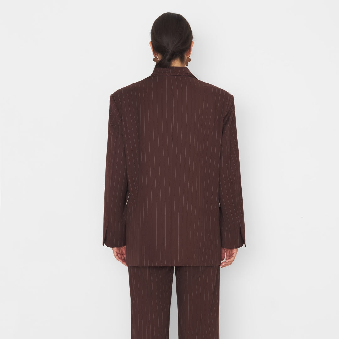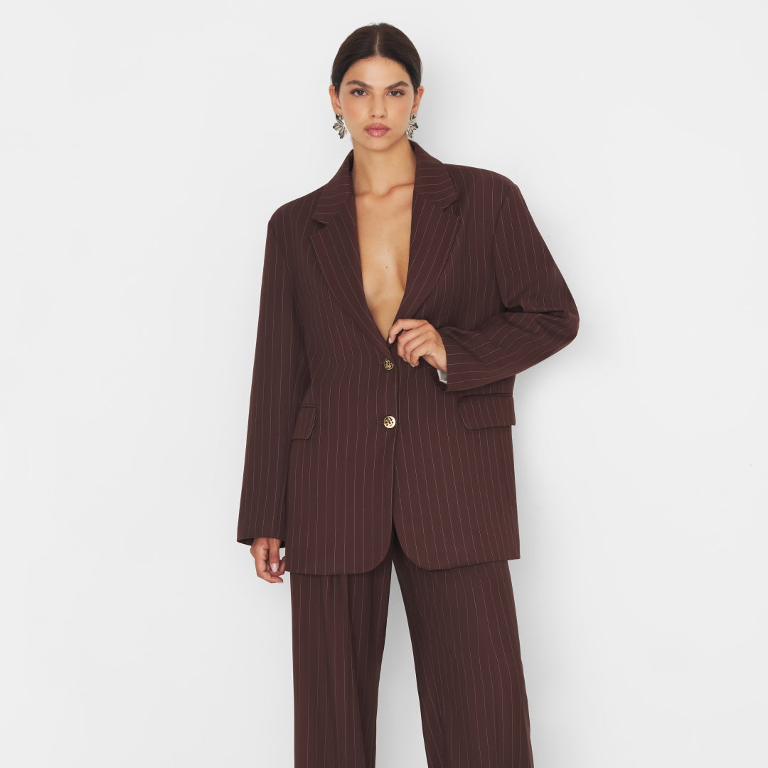Blazer in tessuto gessato color cioccolato, monopetto e due bottoni color oro. Vestibilità oversize, spalloni inseriti (dispopnibili anche varianti colore CREMA e NERO).