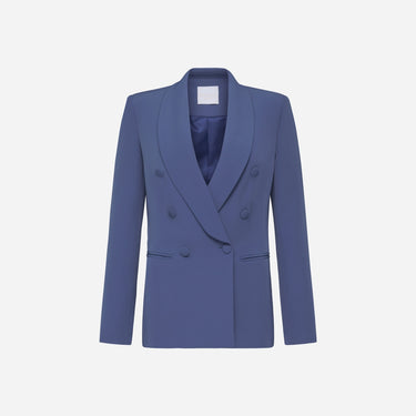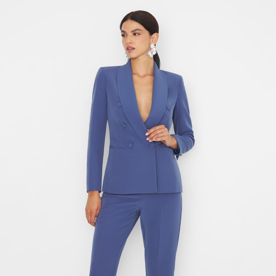 Blazer in tessuto tecnico con bottini fasciati modello slim. Super femminile e super comodo. Bellissimo in questo color denim da abbinare anche al suo pantalone.