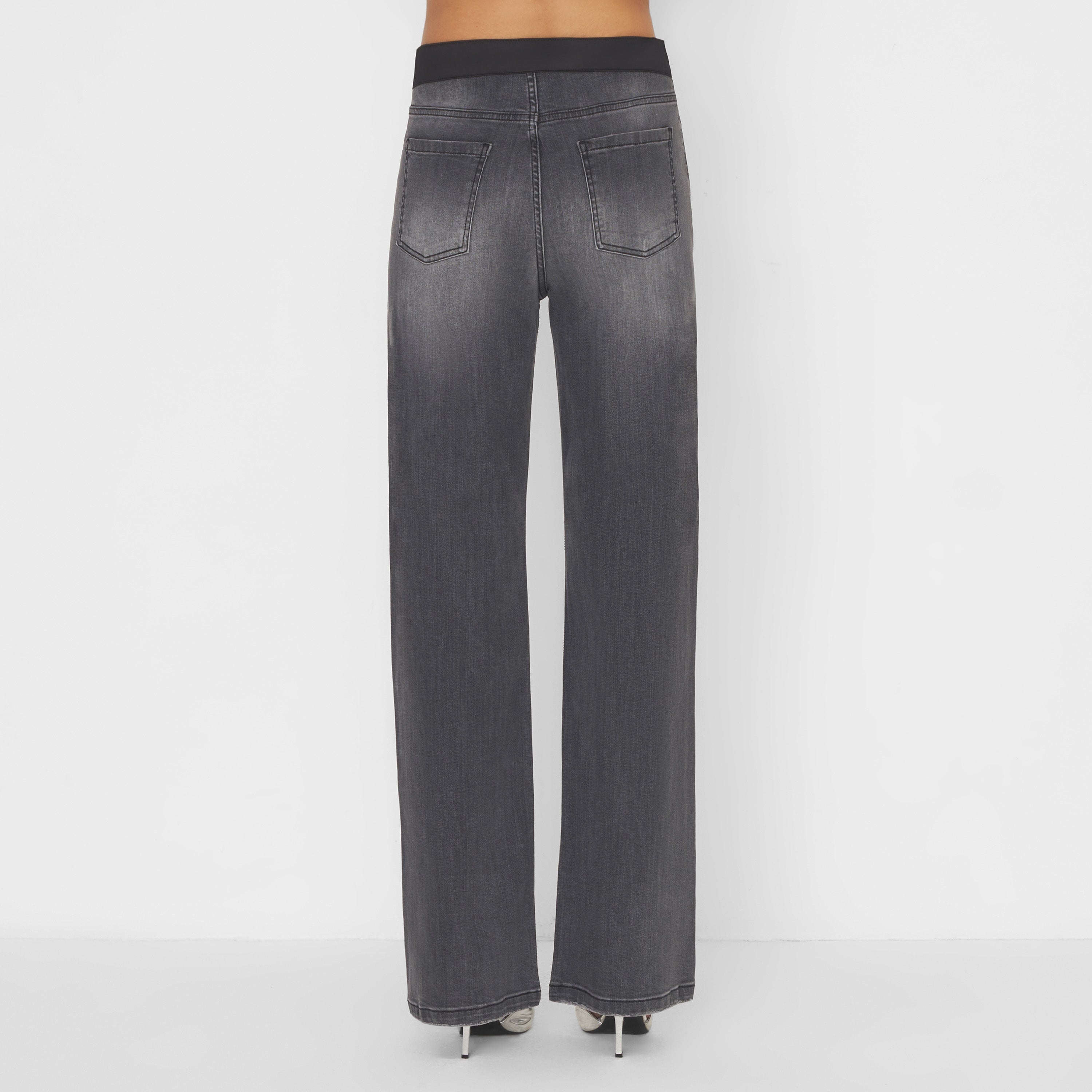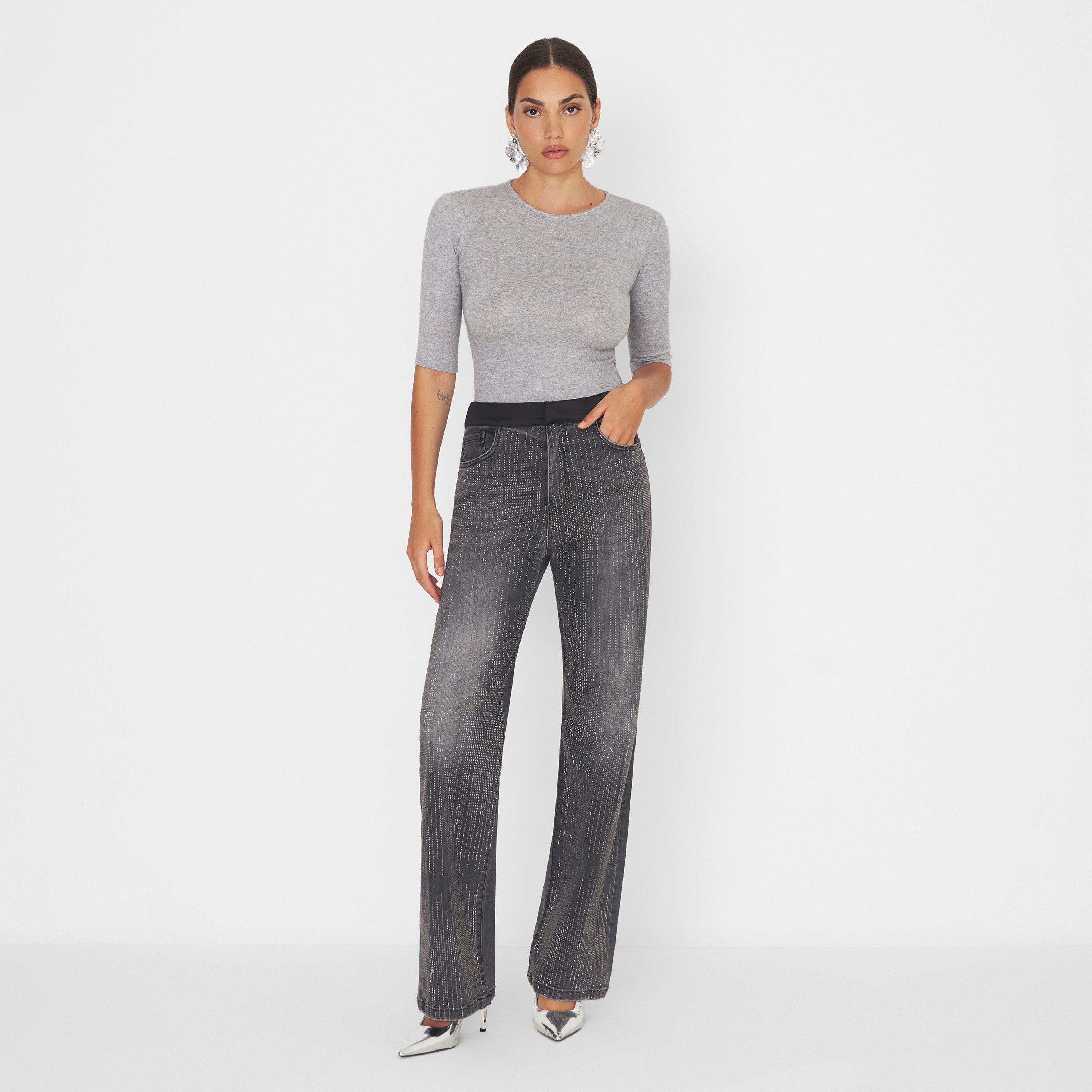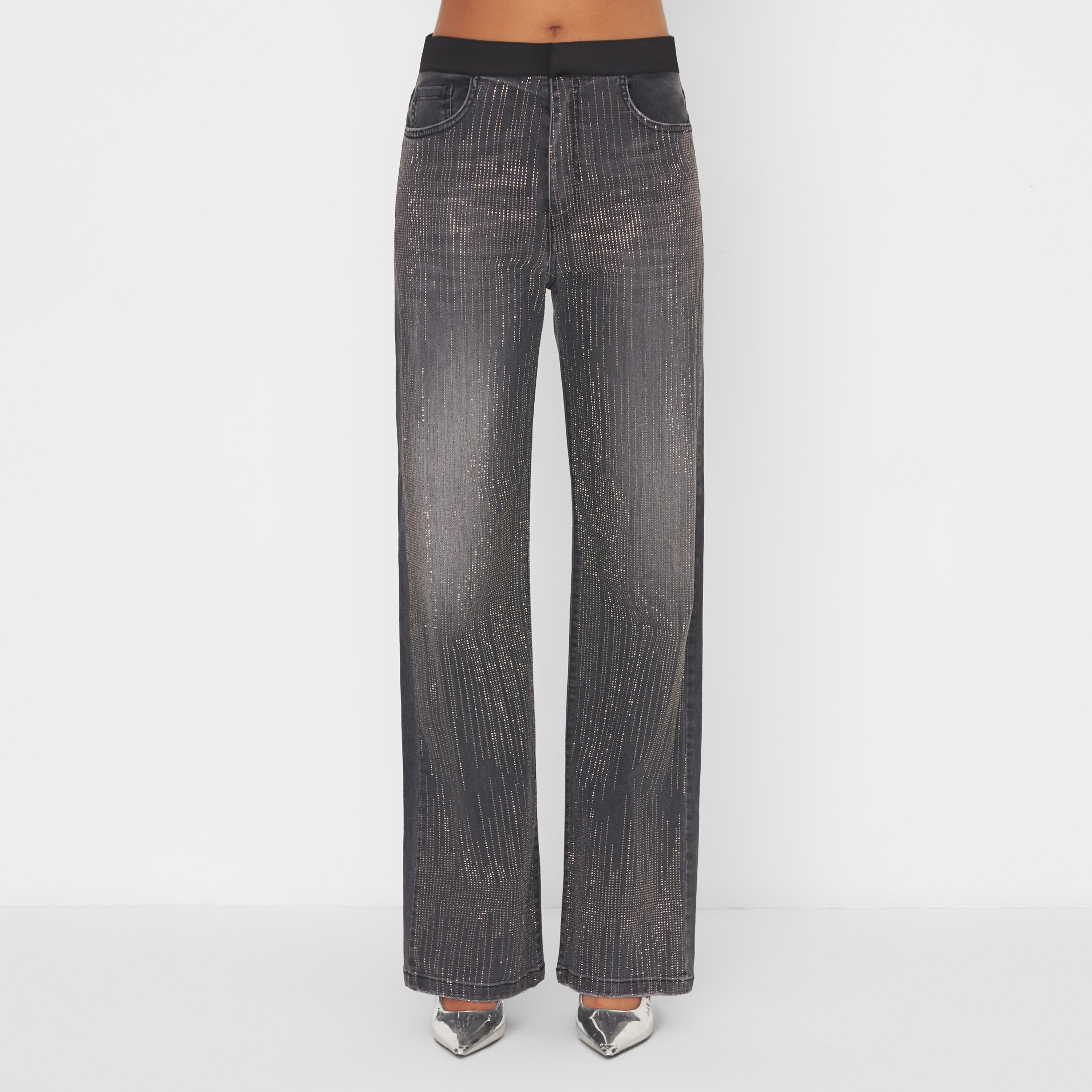 Pantalone in denim nero delavè con applicazione di micro strass a cascata. Cintolo in raso nero, modello cinque tasche. Gamba dritta, vestibilità regolare.