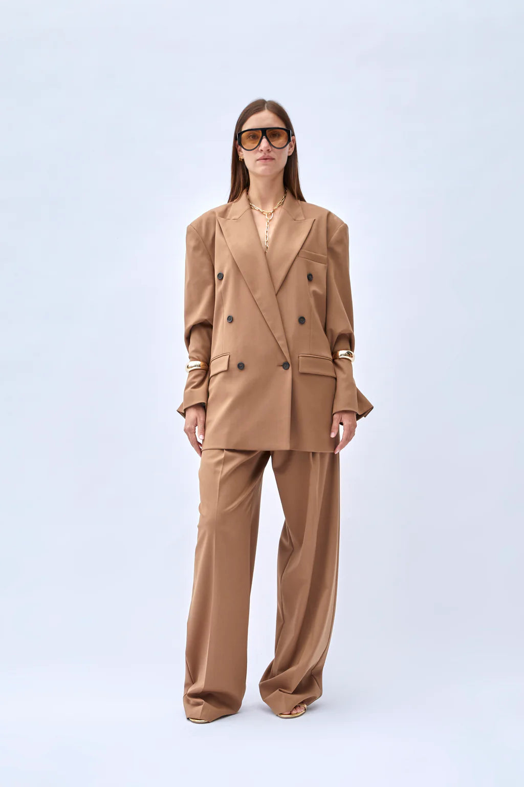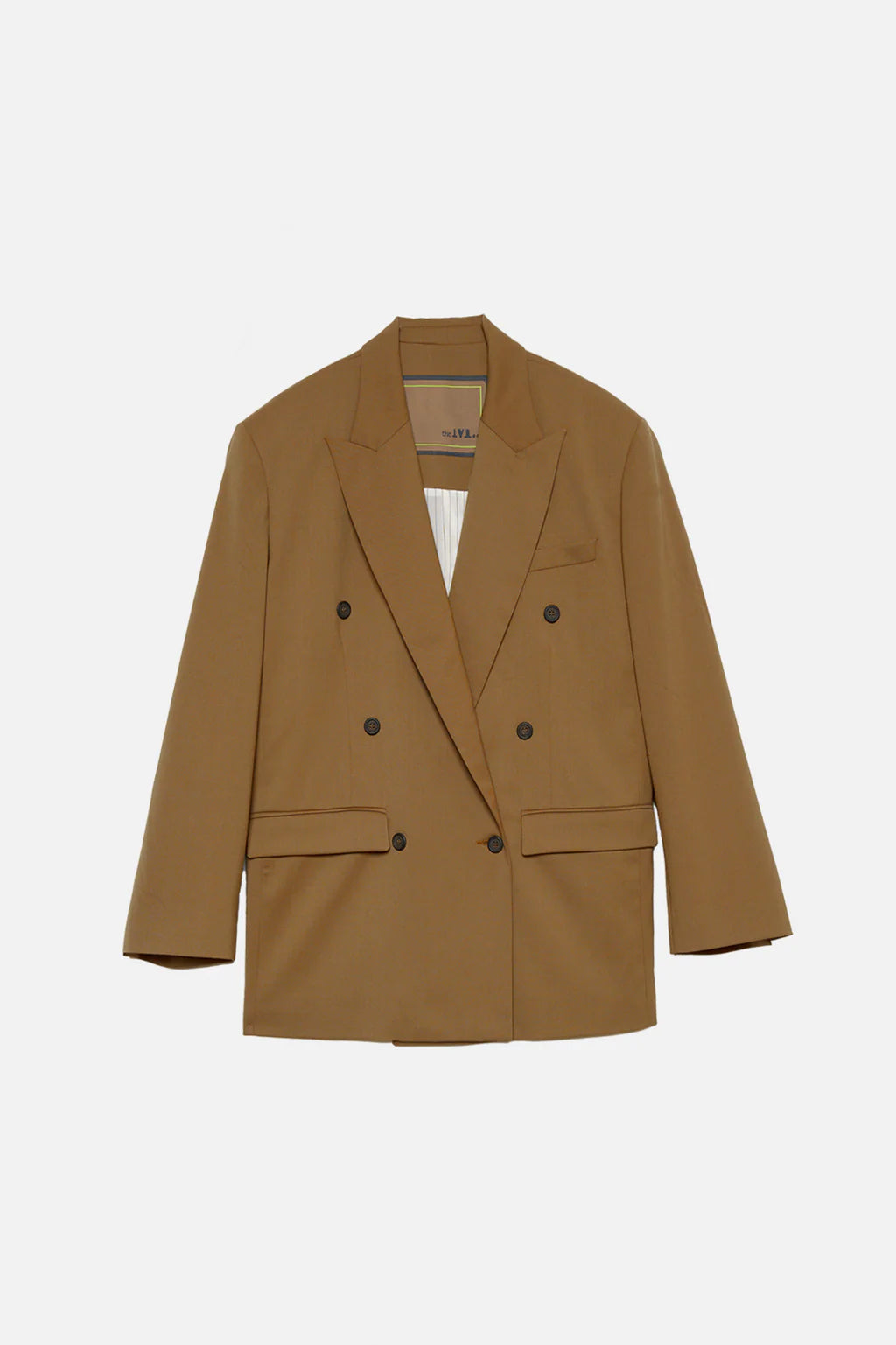 Blazer in fresco di lana con collo a lancia, chiusura doppio petto, vestibilità oversize super comoda.