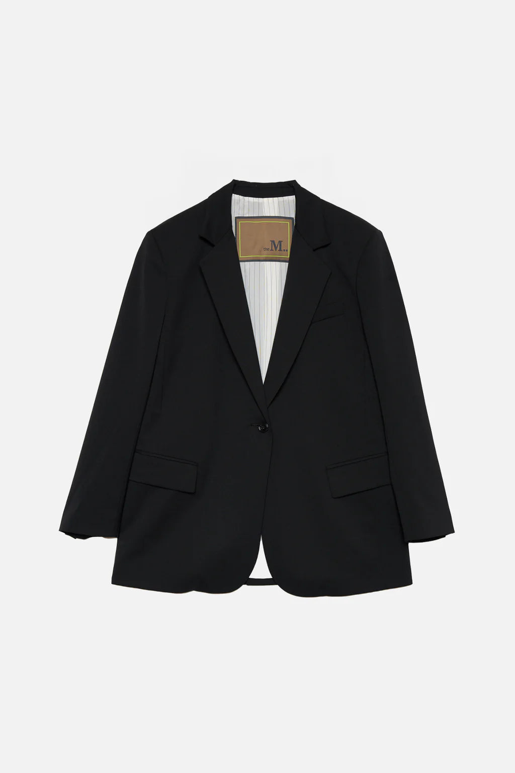 Blazer in fresco di lana a un bottone dal taglio maschile oversize. Vestibilità comoda, lunghezza sotto i fianchi. Spacco dietro ed etichetta logo sul collo dietro.