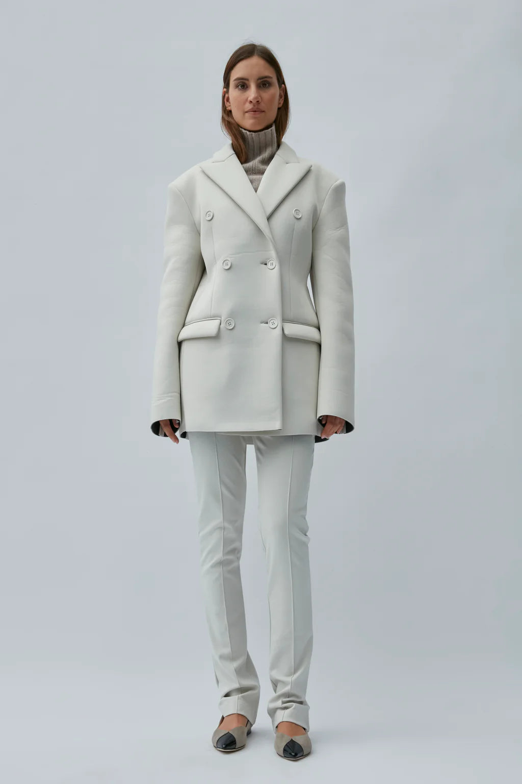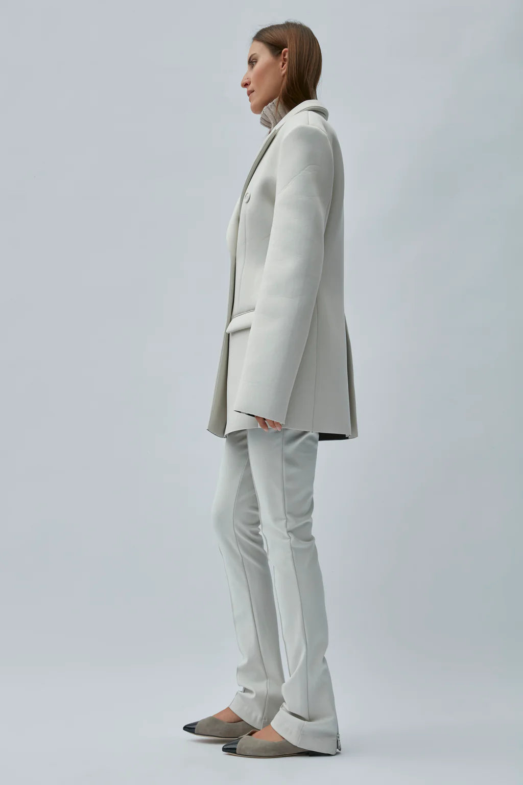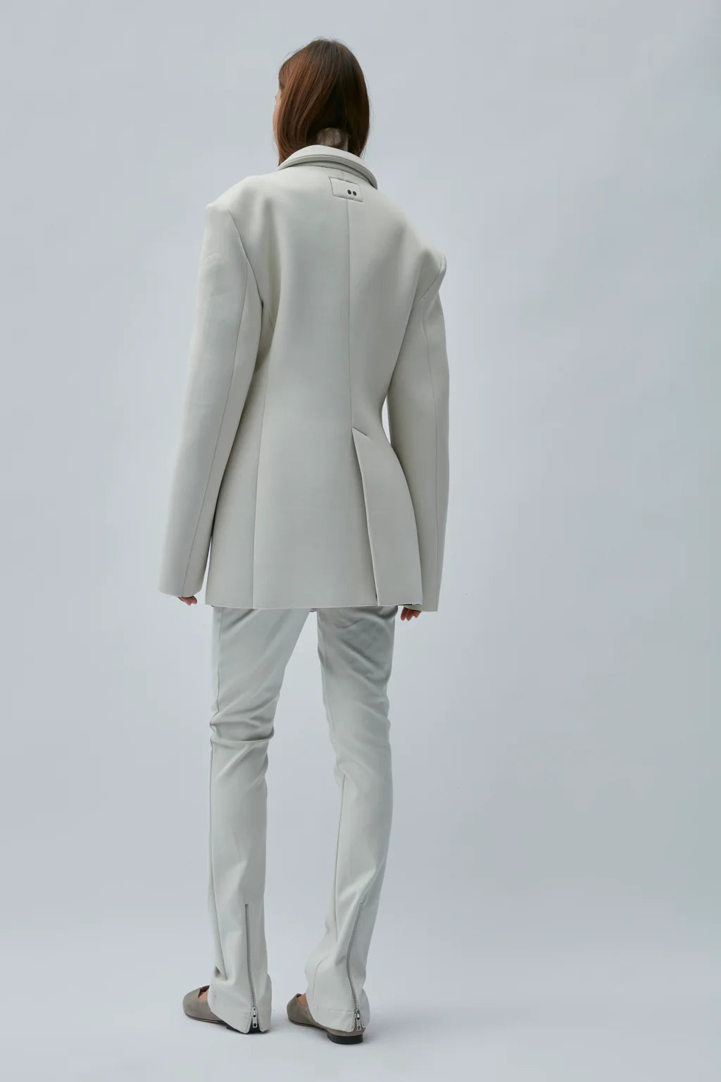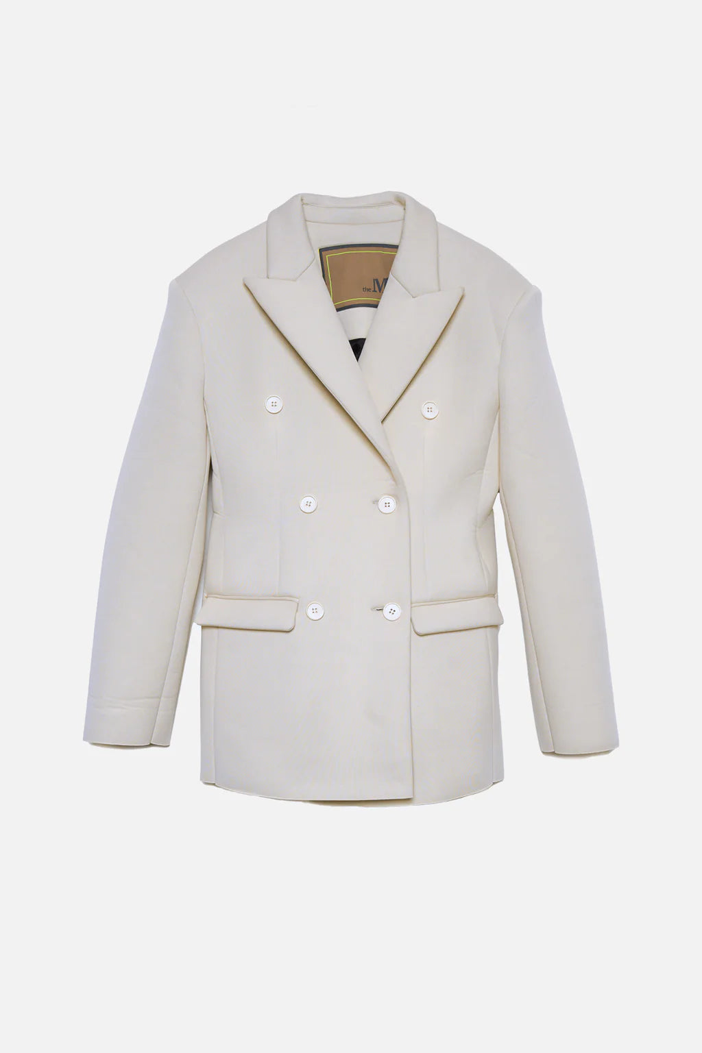 Blazer in tessuto neoprene color mastice doppiopetto. Leggermente sfiancato, spacco centrale sul retro.