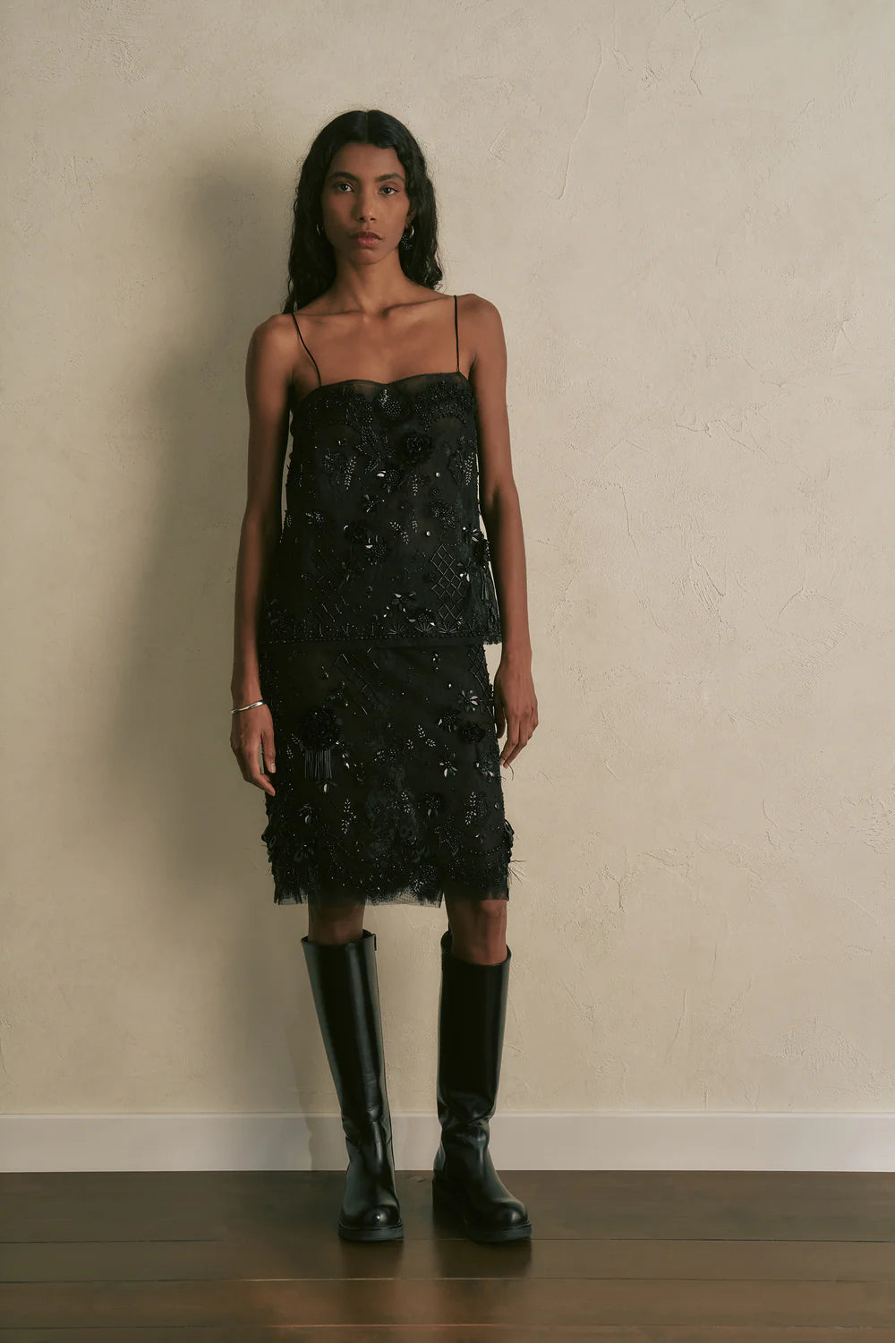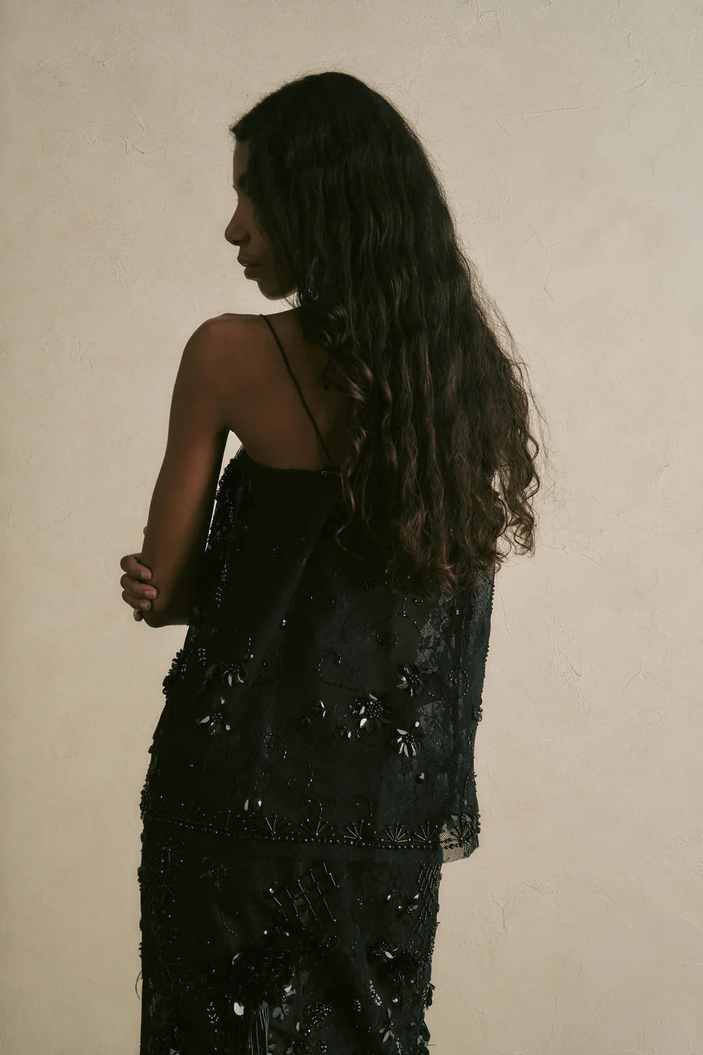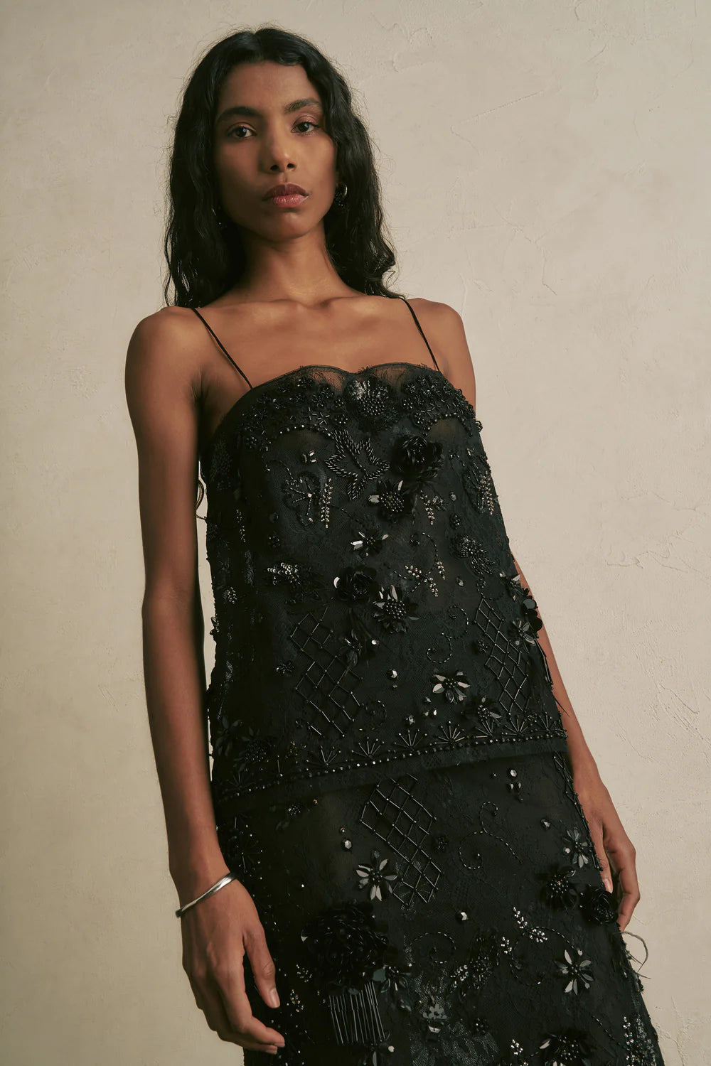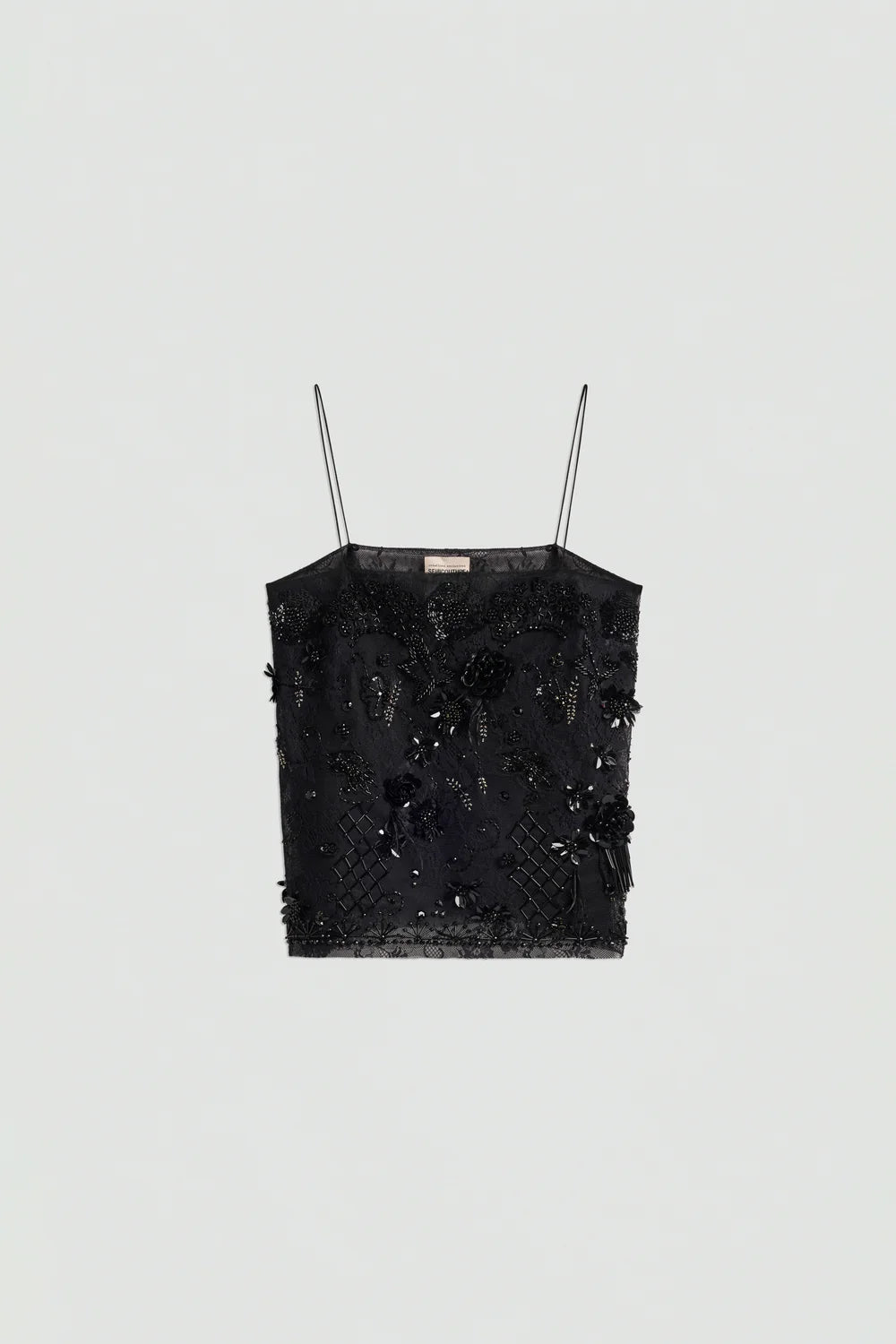 Top in pizzo con ricami di perline, paillettes e piume. Spallini sottili, vestibilità regolare.