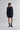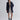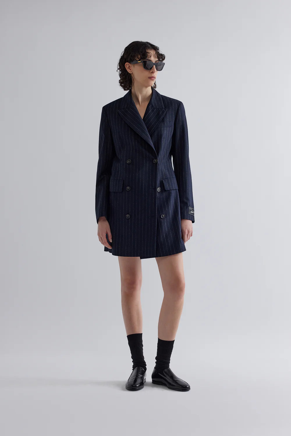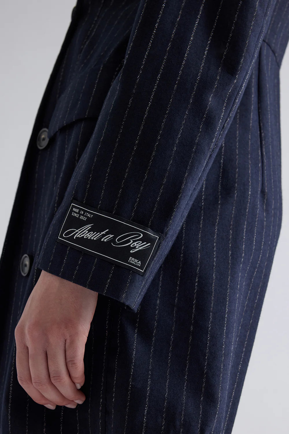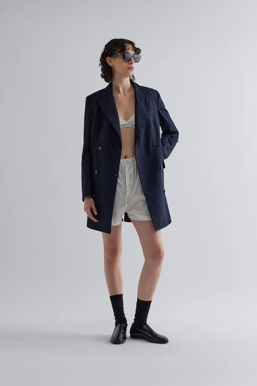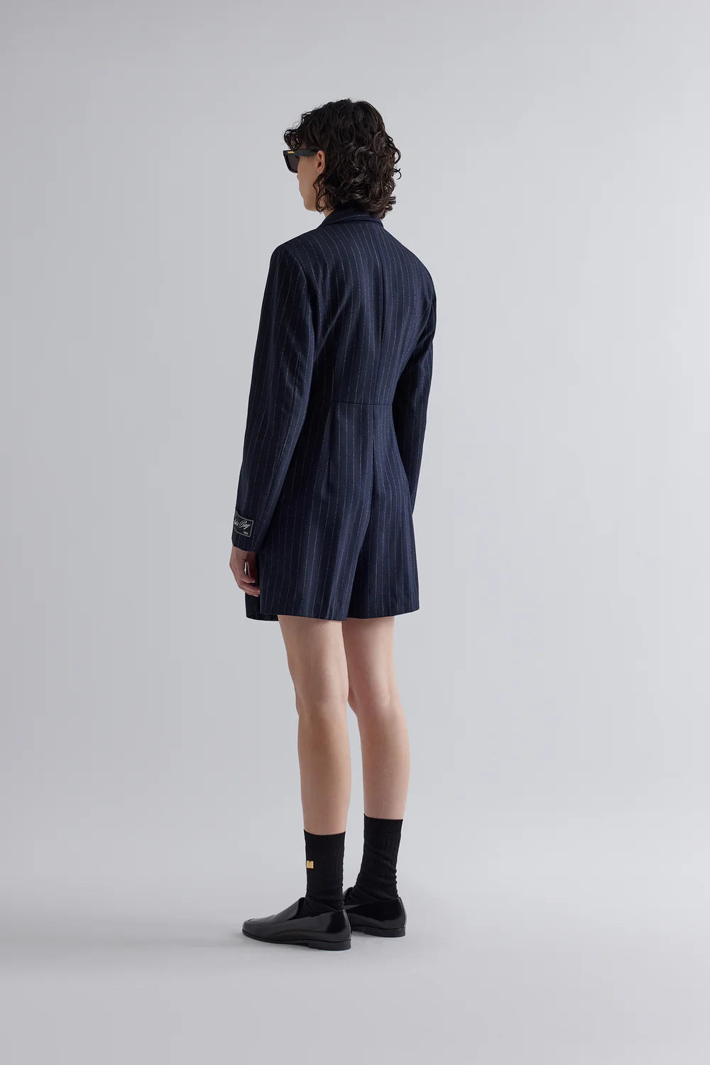 Tuta corta in panno di lana blu con gessatura panna stile giacca. Pantaloncino stile boxer attaccato sotto, chiusura a doppio petto, vestibilità comoda.