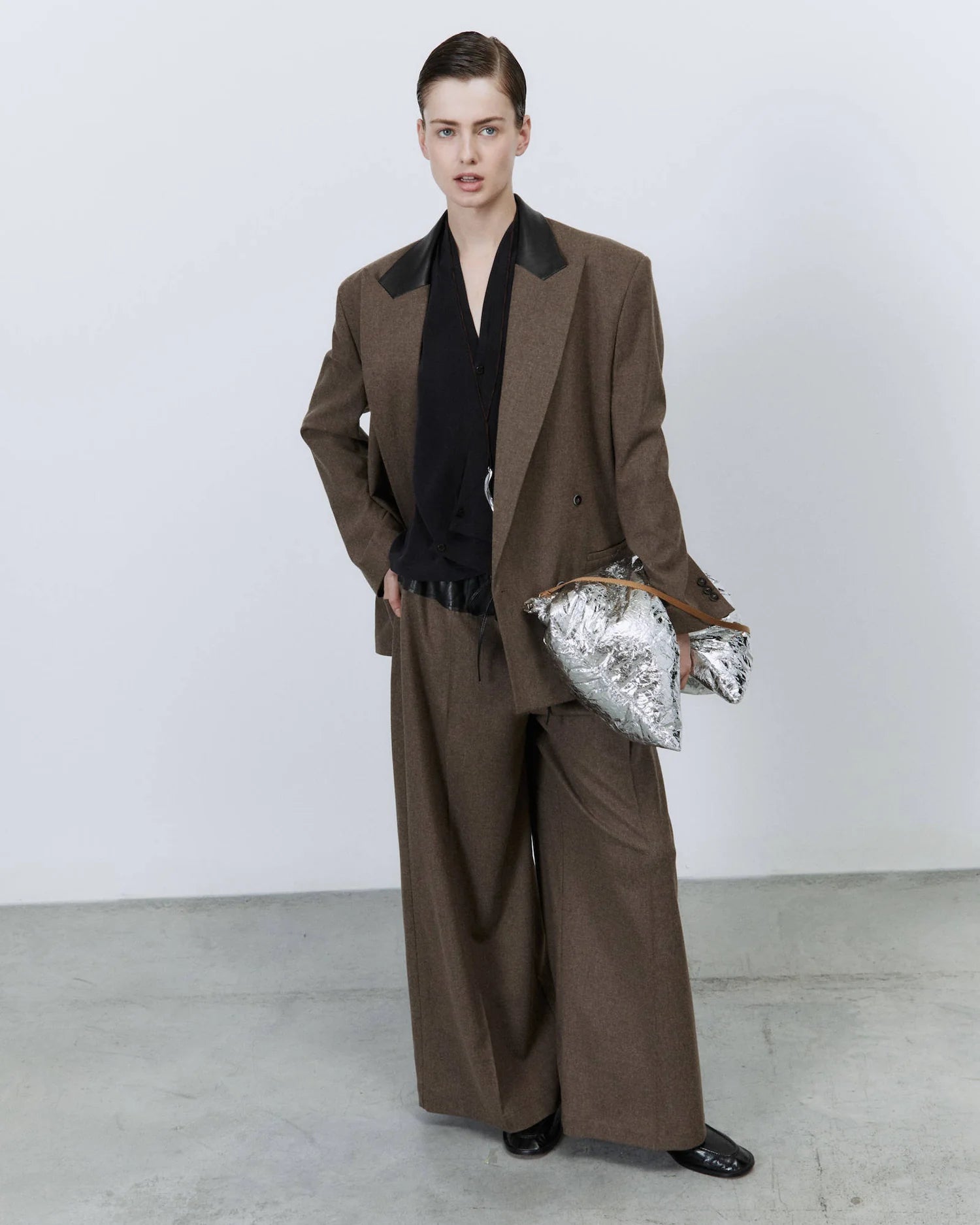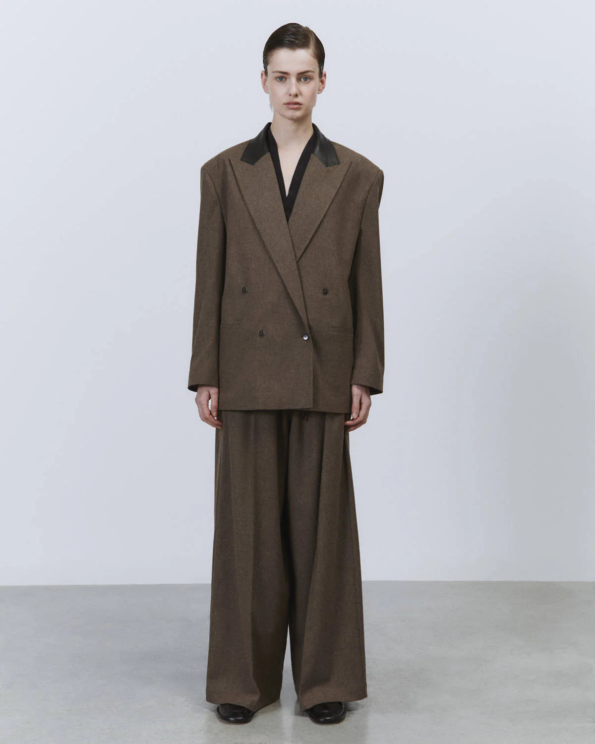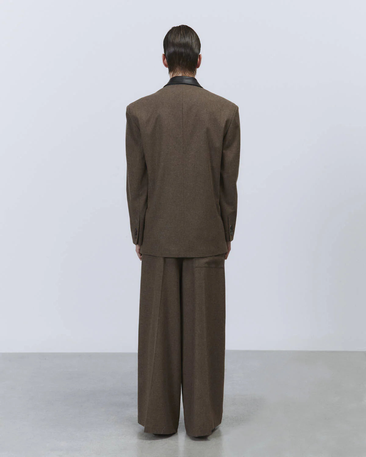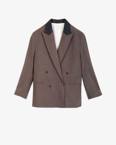 Blazer doppiopetto in flanella di viscosa misto lana con collo a contrasto in pelle. Rever a lancia, tasche a filetto, vestibilità oversize.