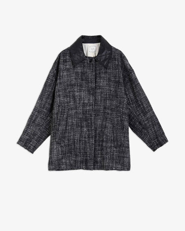 Cappotto dal taglio maschile e dal gusto vintage in tweed con colletto a contrasto rivestito in pelle nera. Chiusura con bottoni sul davanti, tasche laterali, lunghezza a metà coscia.