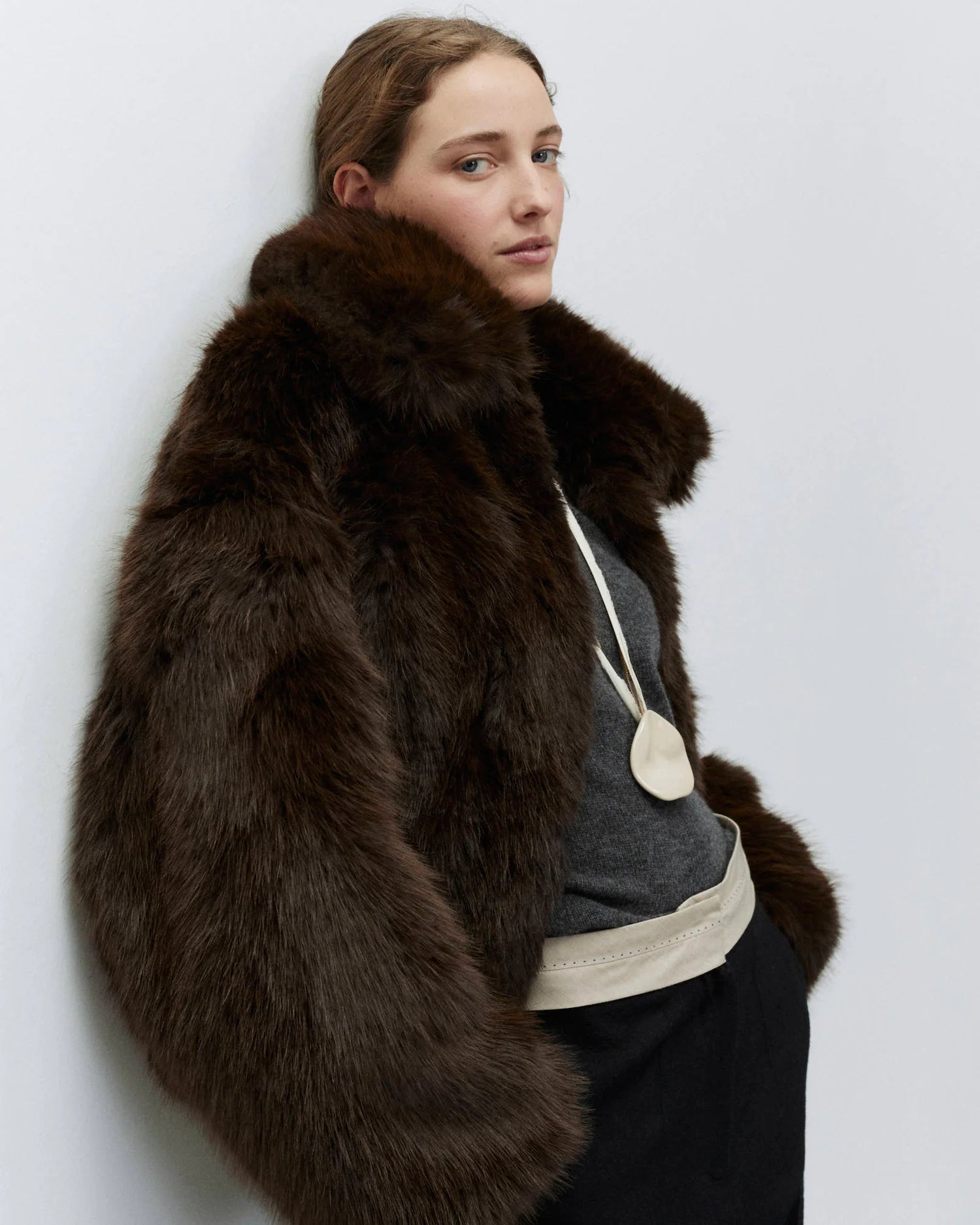 Giubbino in ecopelliccia lungo sui fianchi e collo camicia. Vestibilità comoda, manica lunga.