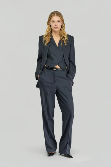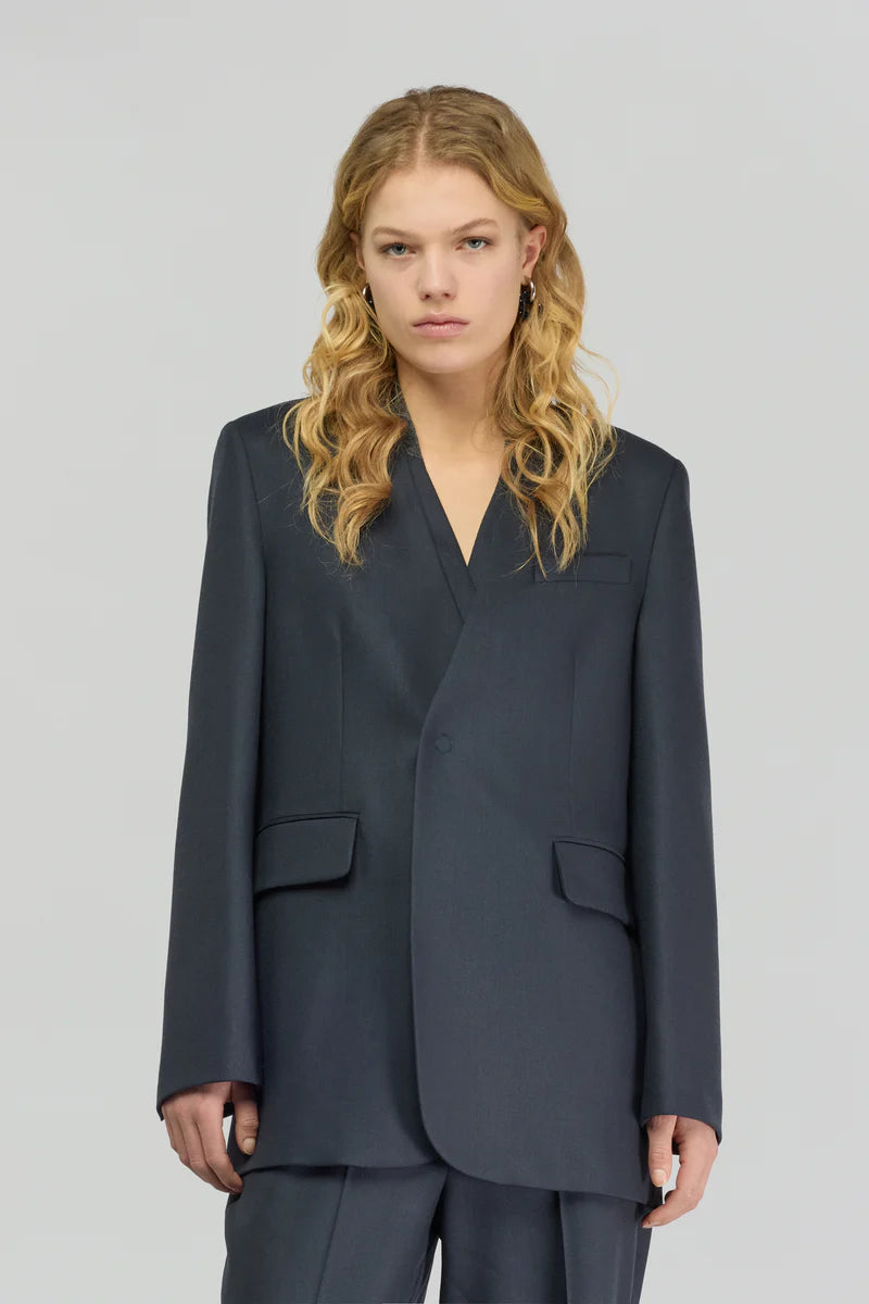 Giacca in flanella con scollo a V profondo. Chiusura monopetto con taschino a filetto e tasche. Vestibilità regolare, leggermente over dal gusto maschile (disponibile variante colore OSSIGENO).